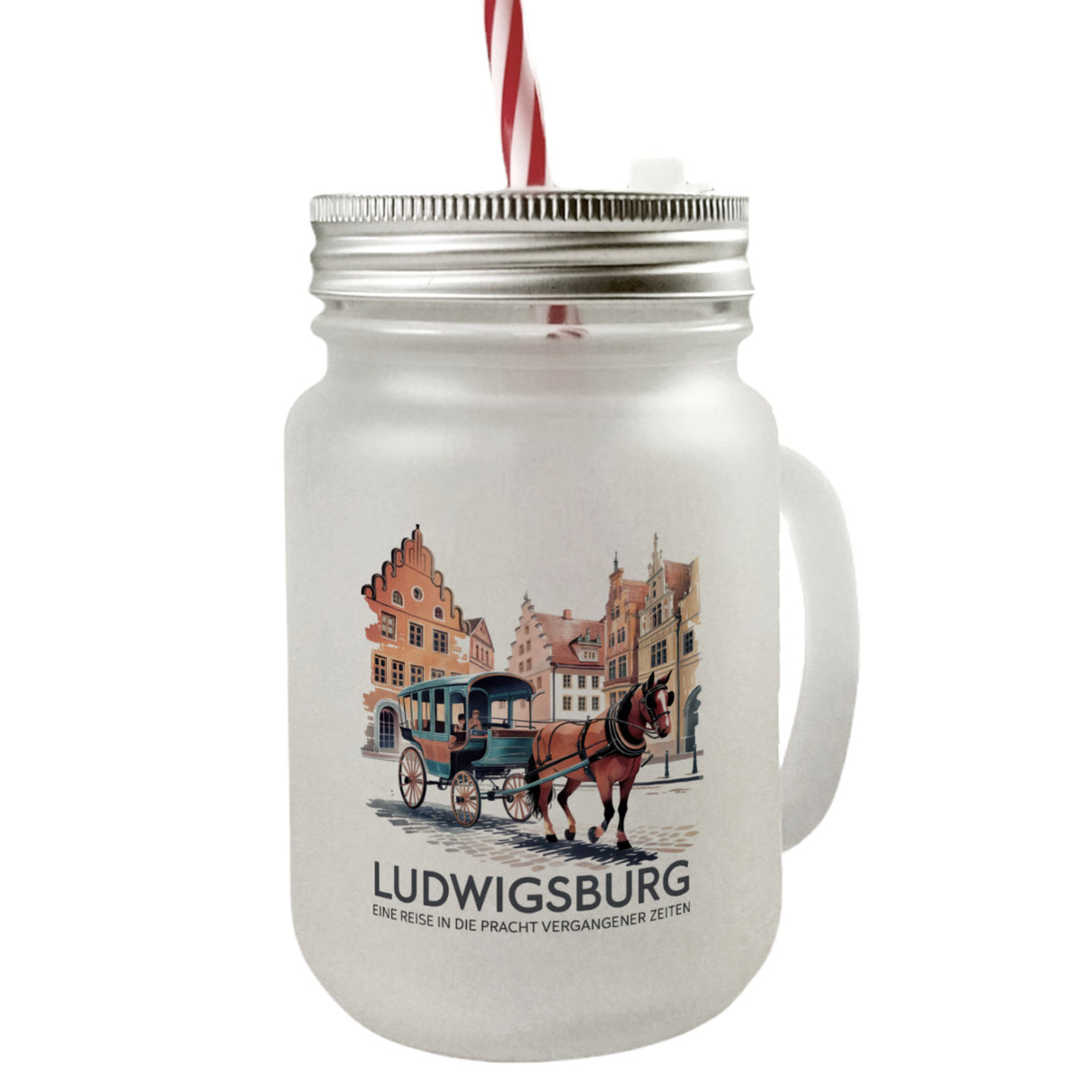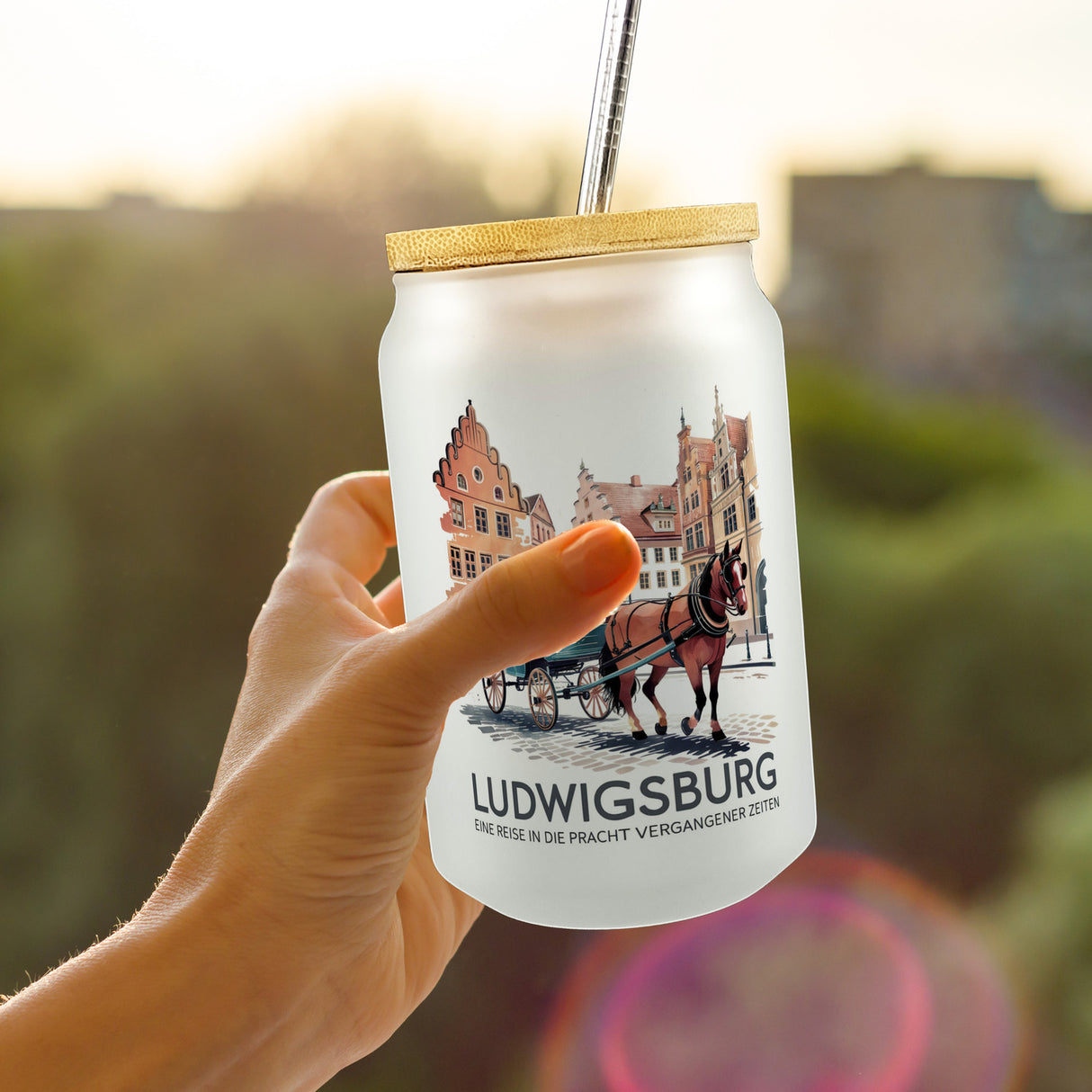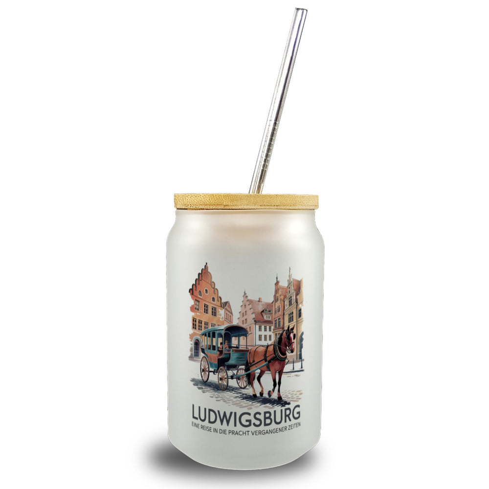 Ludwigsburg Reise Trinkglas mit Bambusdeckel Pferdekutsche auf Kopfsteinpflaster