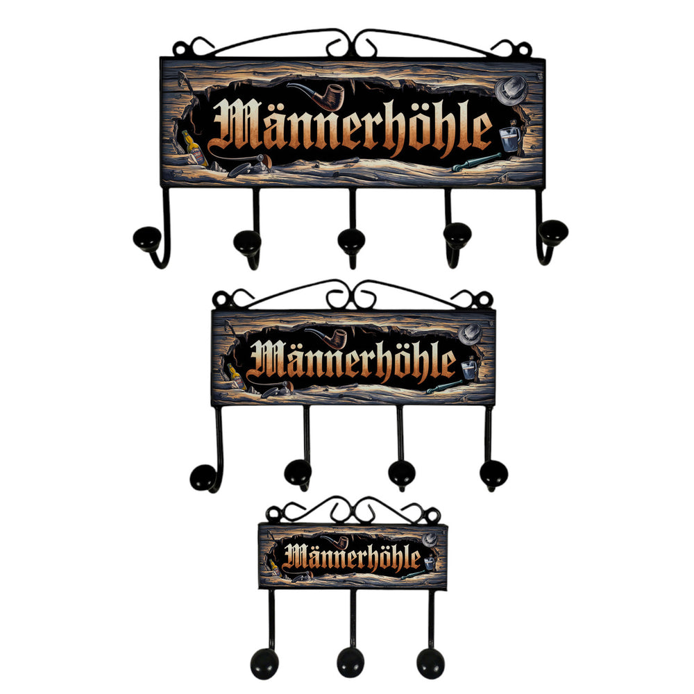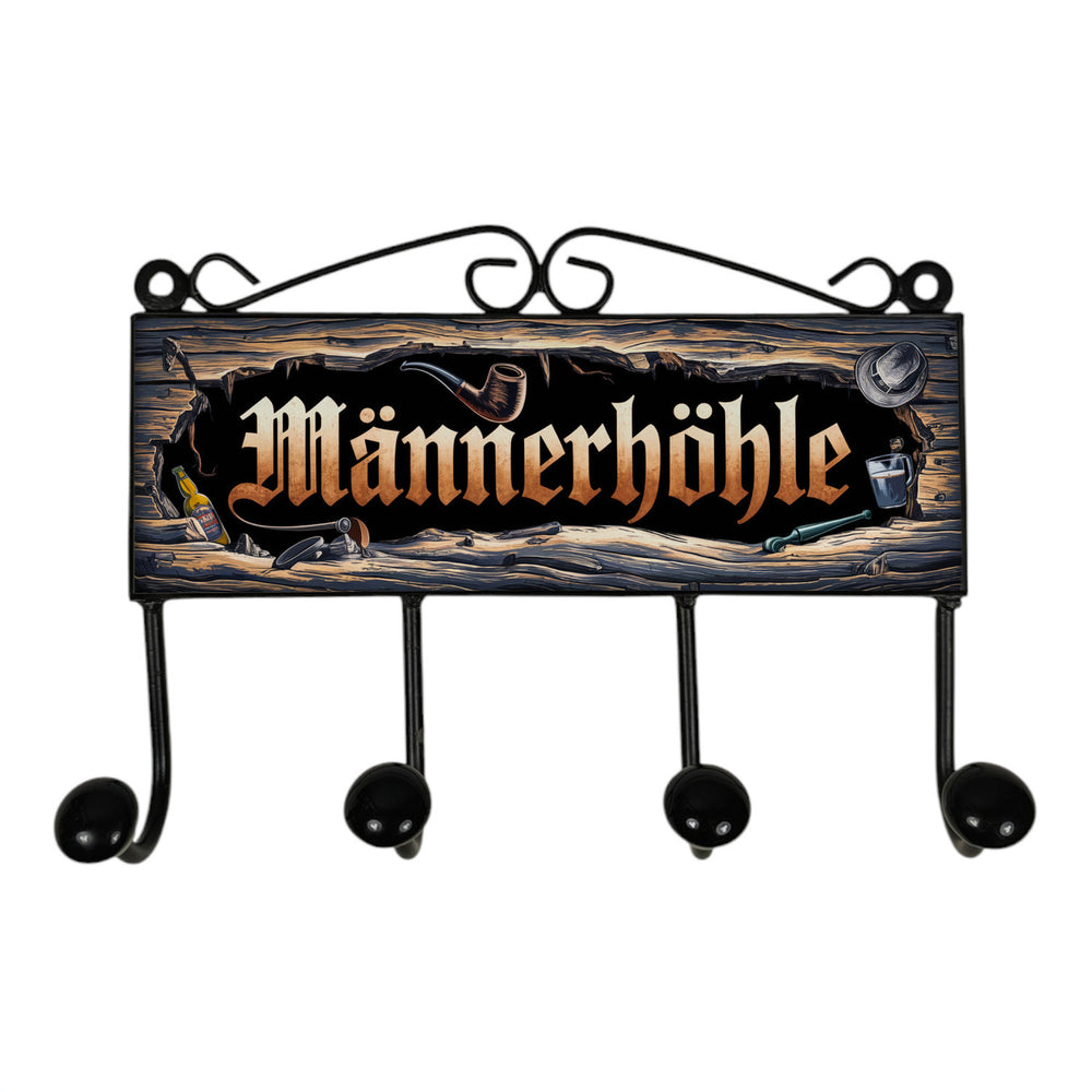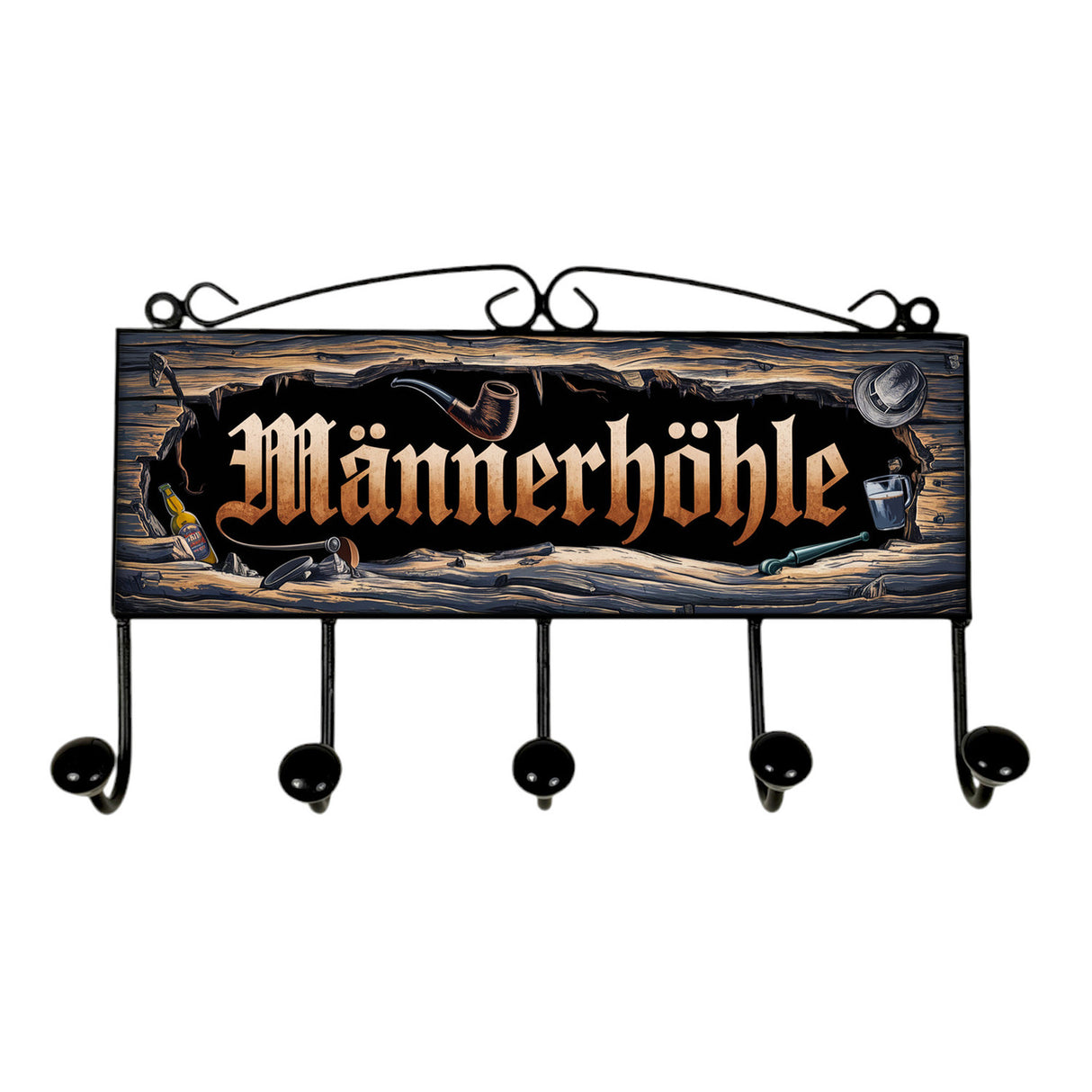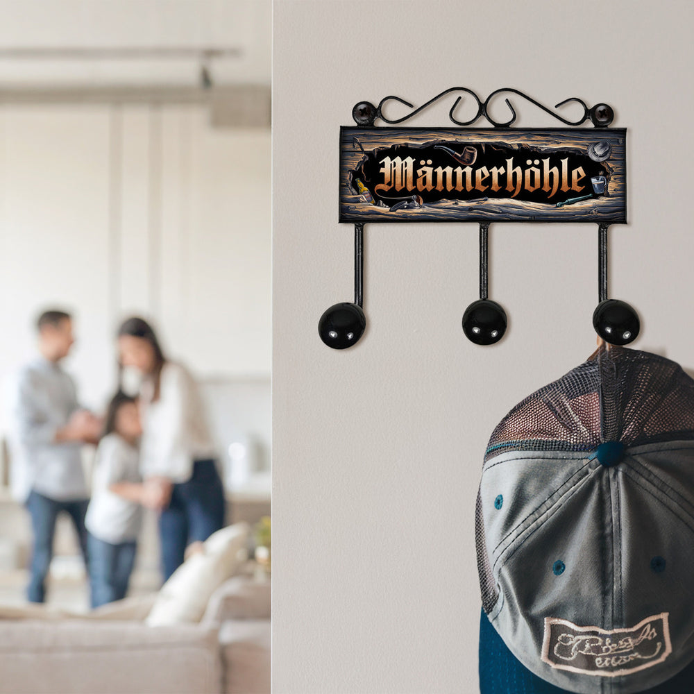 - Die Männerhöhle Kleiderhakenleiste ist ein echter Hingucker! Mit ihrem rustikalen Holzhintergrund und dem kraftvollen Schriftzug "Männerhöhle" versprüht sie authentischen Retro-Charme. Umgeben von Bierflasche, Pfeife und Hut lädt dieses einzigartige Design zum Schmunzeln ein und bringt maskuline Deko in dein Zuhause.