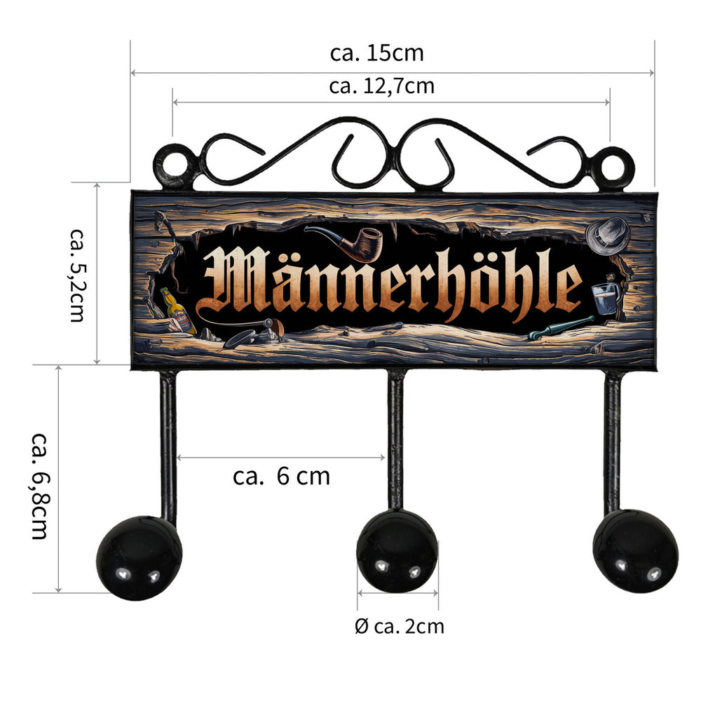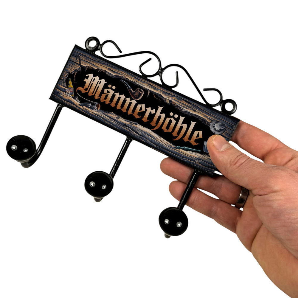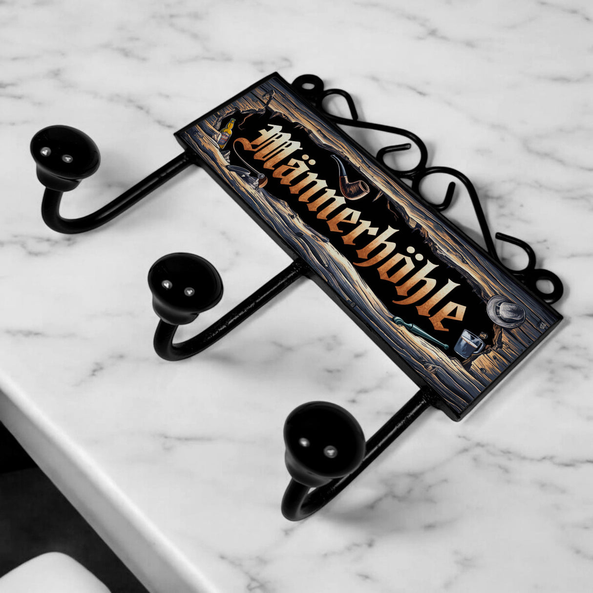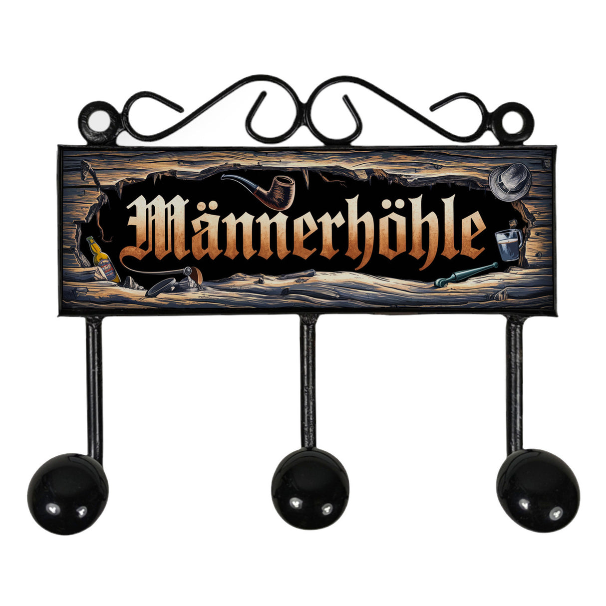 - Die Männerhöhle Kleiderhakenleiste ist ein echter Hingucker! Mit ihrem rustikalen Holzhintergrund und dem kraftvollen Schriftzug "Männerhöhle" versprüht sie authentischen Retro-Charme. Umgeben von Bierflasche, Pfeife und Hut lädt dieses einzigartige Design zum Schmunzeln ein und bringt maskuline Deko in dein Zuhause.