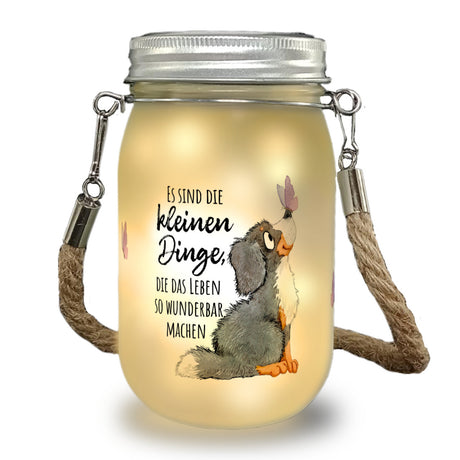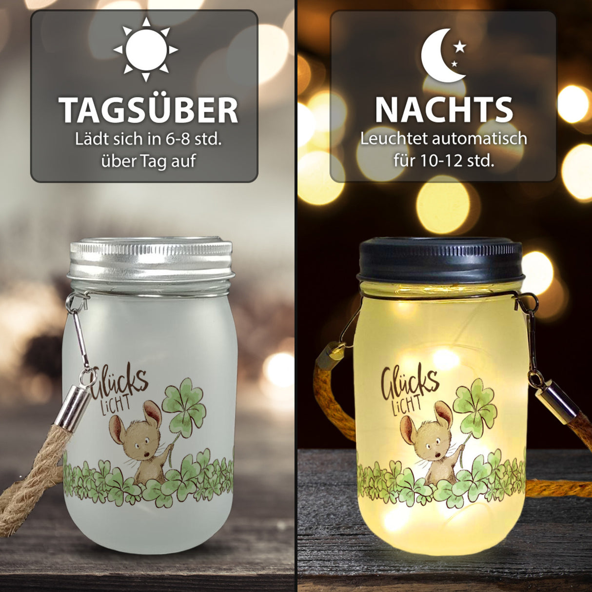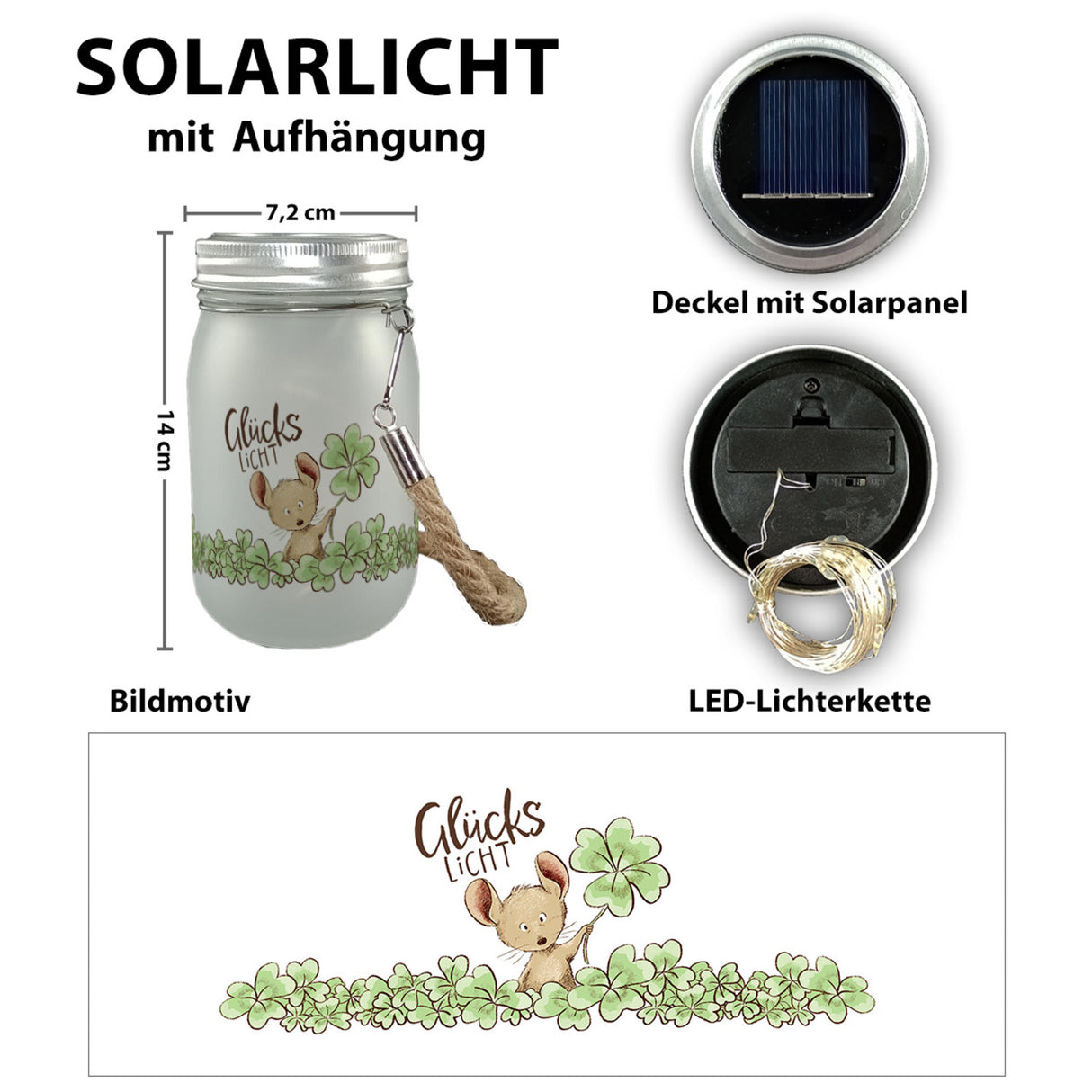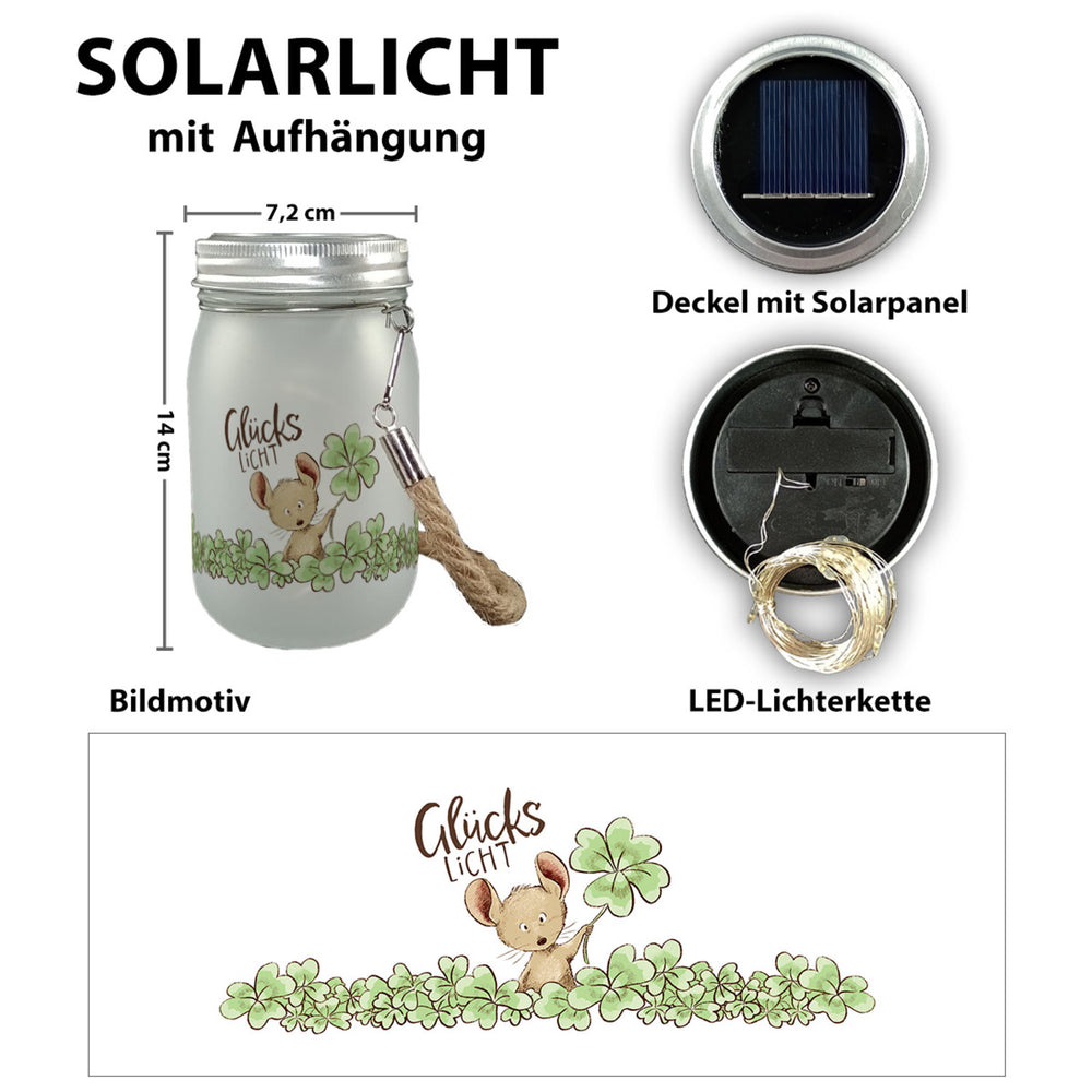- Unser Solarlicht mit Maus-Motiv ist ein echter Hingucker! Es zeigt eine putzige Maus in einem Kleefeld, die stolz ein vierblättriges Kleeblatt präsentiert. Das Licht ist in einem Einmachglas mit Solardeckel und nostalgischem Strickhenkel eingefasst - ideal für den Fenstersims oder als Dekolicht.