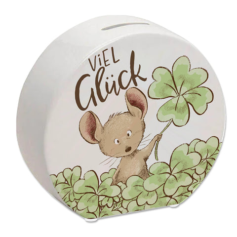 Maus mit Fliegenpilz Spardose mit Spruch Viel Glück