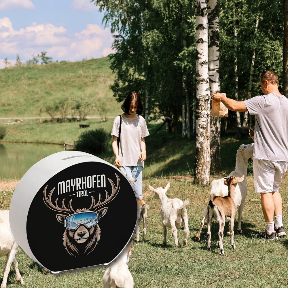 - Die MAYRHOFEN Tirol Spardose ist ein echter Hingucker! Sie präsentiert einen majestätischen Rothirsch mit modernen Schneebrillen, eingerahmt von imposanten Geweihen. Auf schwarzem Hintergrund thront der Schriftzug MAYRHOFEN TIROL. Das alpine Design mit schneebedeckten Gipfeln und klarem Himmel sorgt für Erhabenheit und Winterfeeling.