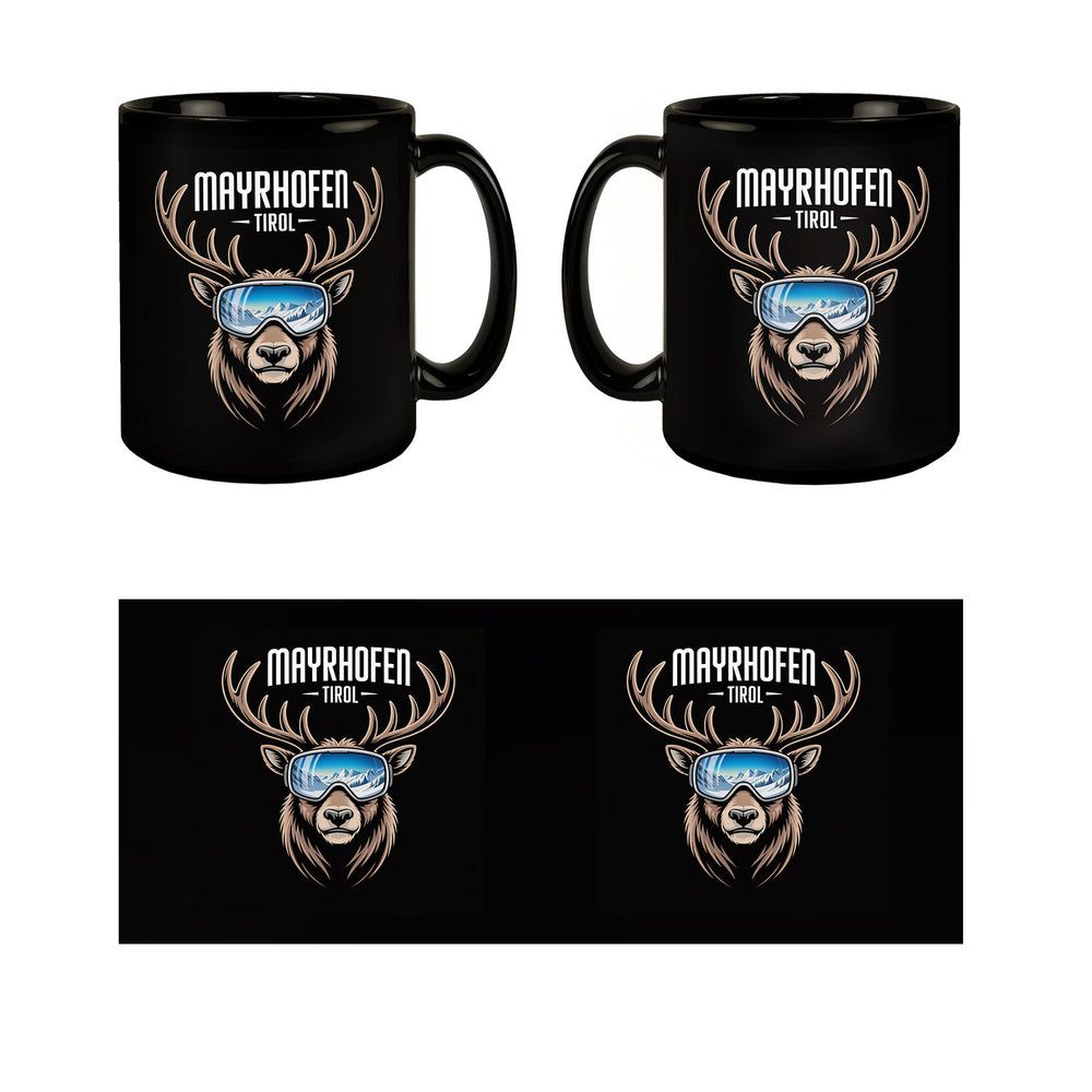 Die MAYRHOFEN Tirol Tasse begeistert durch ein faszinierendes Design: Ein stolzer Rothirsch mit modernen Schneebrillen vor tiefschwarzem Hintergrund. Die Geweihstangen rahmen einen atemberaubenden Panoramablick auf schneebedeckte Berge ein. Die markante A Hinweise: Fassungsvermögen: ca. 300ml