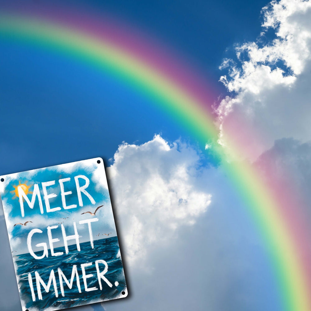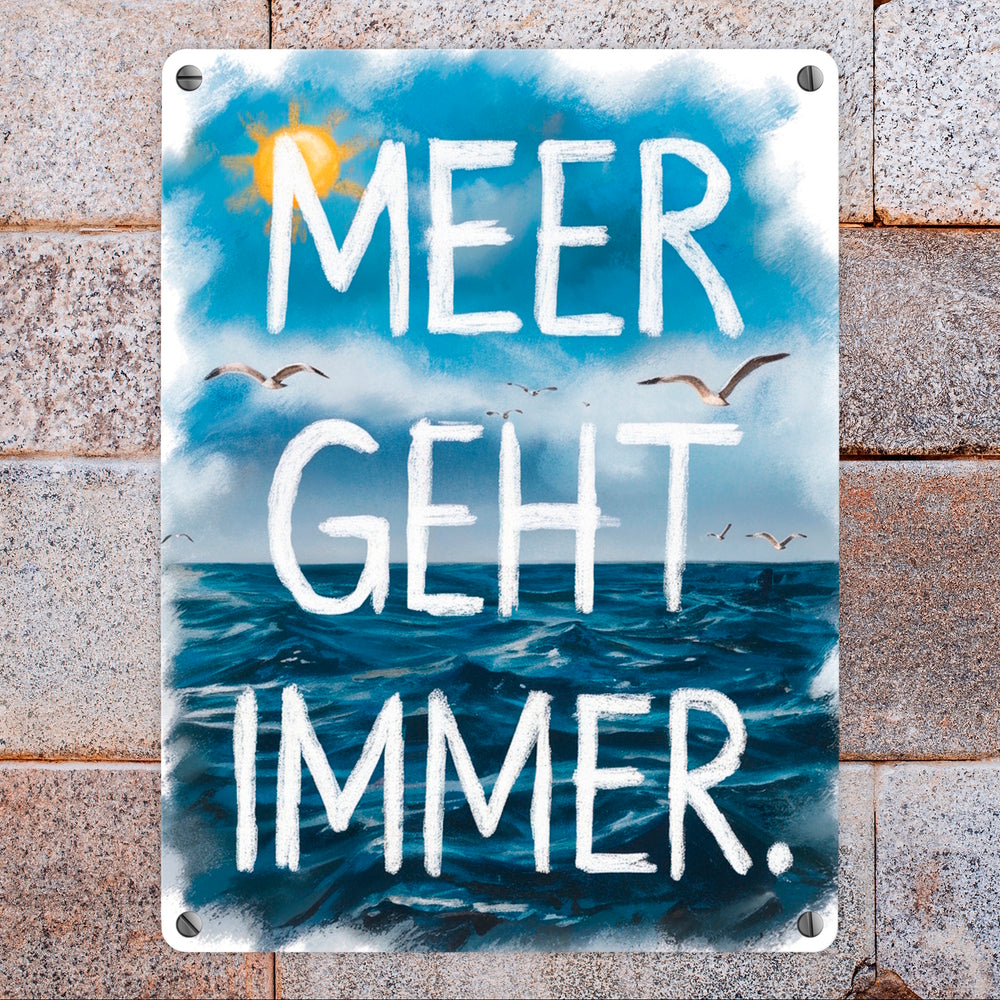 - Dieses charmante Metallschild zeigt ein farbenfrohes Aquarell-Design mit Möwen und einem endlosen Ozean unter strahlendem Sonnenschein. Der Schriftzug 'MEER GEHT IMMER' in Großbuchstaben prangt auf dem weißen Hintergrund. Die lebendige Meereslandschaft und der klare blaue Himmel verleihen dem Schild ein Gefühl von Tiefe und Frische.