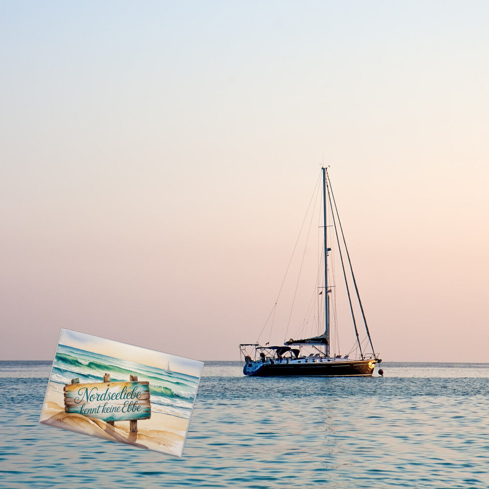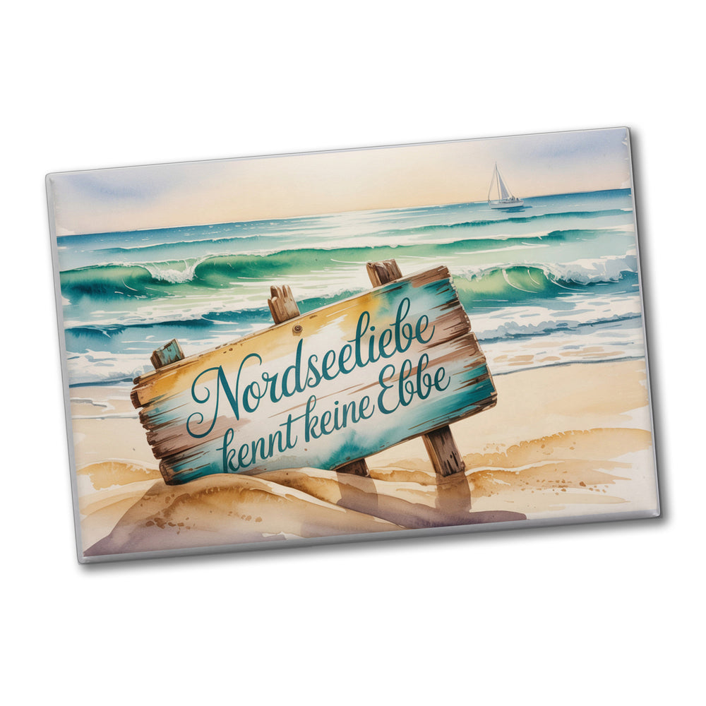 - Das Souvenir-Magnet zeigt ein Aquarell-Meereslandschaftsgemälde mit einem verwitterten Holzschild im Mittelpunkt. In türkisfarbener und goldener Schrift steht "Nordseeliebe kennt keine Ebbe". Sanfte Wellen und ein entferntes Segelboot ergänzen die Szenerie, die von diffusem Nachmittagslicht in eine warme, nostalgische Atmosphäre getaucht wird.