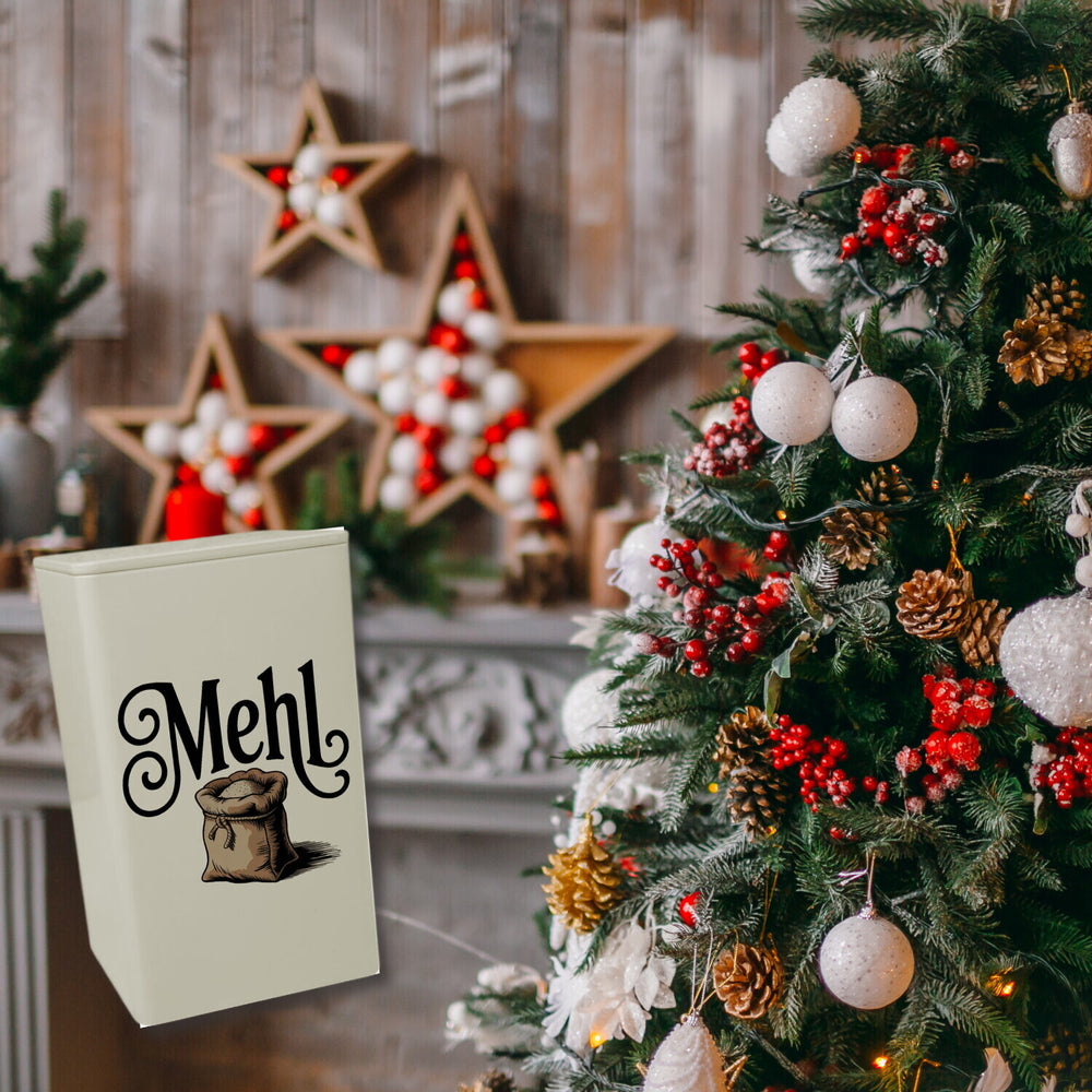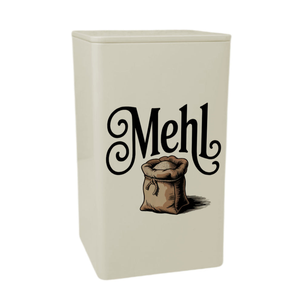- Diese charmante Vorratsdose im Vintage-Stil zaubert nostalgische Gefühle in jede Küche. Das Design zeigt den Schriftzug "Mehl" in kunstvoller, handgefertigter Typografie, umrahmt von einem retro-inspirierten Mehlsack in warmem Creme und Braun. Der Sack wirkt durch seine Jute-Textur und feine Nähdetails besonders authentisch.