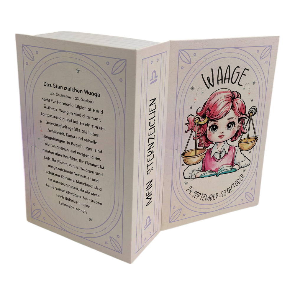 - Erleben Sie das charmante Design des 'Mein Sternzeichen Booksafe - Waage'. Auf dem Cover bezaubert ein Cartoon-Mädchen mit rosa Haaren, das eine Waage hält. Mit weißer Bluse und rosa Weste harmoniert sie perfekt mit dem pastellfarbenen Hintergrund in Rosa und Lila. Ein echter Hingucker für alle Waage-Fans!
