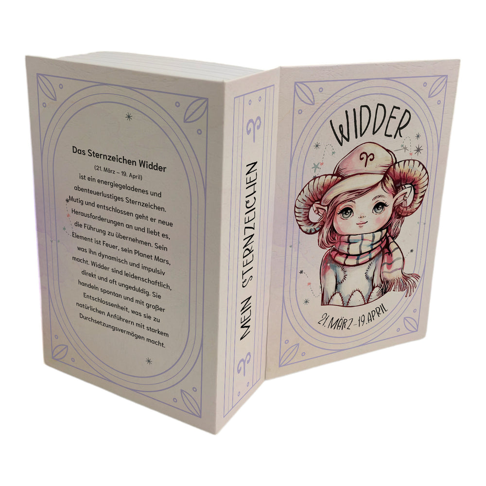 - Der "Mein Sternzeichen Booksafe - Widder" ist ein bezauberndes Buch mit einem lustigen Spruch für Astrologie-Fans. Die dynamische Widder-Illustration mit Hörnern, Hut und Schal sticht auf einem lila Pastellhintergrund hervor. Perfekt für jeden Widder, der stolz auf seine Sternzeichen-Attribute ist!