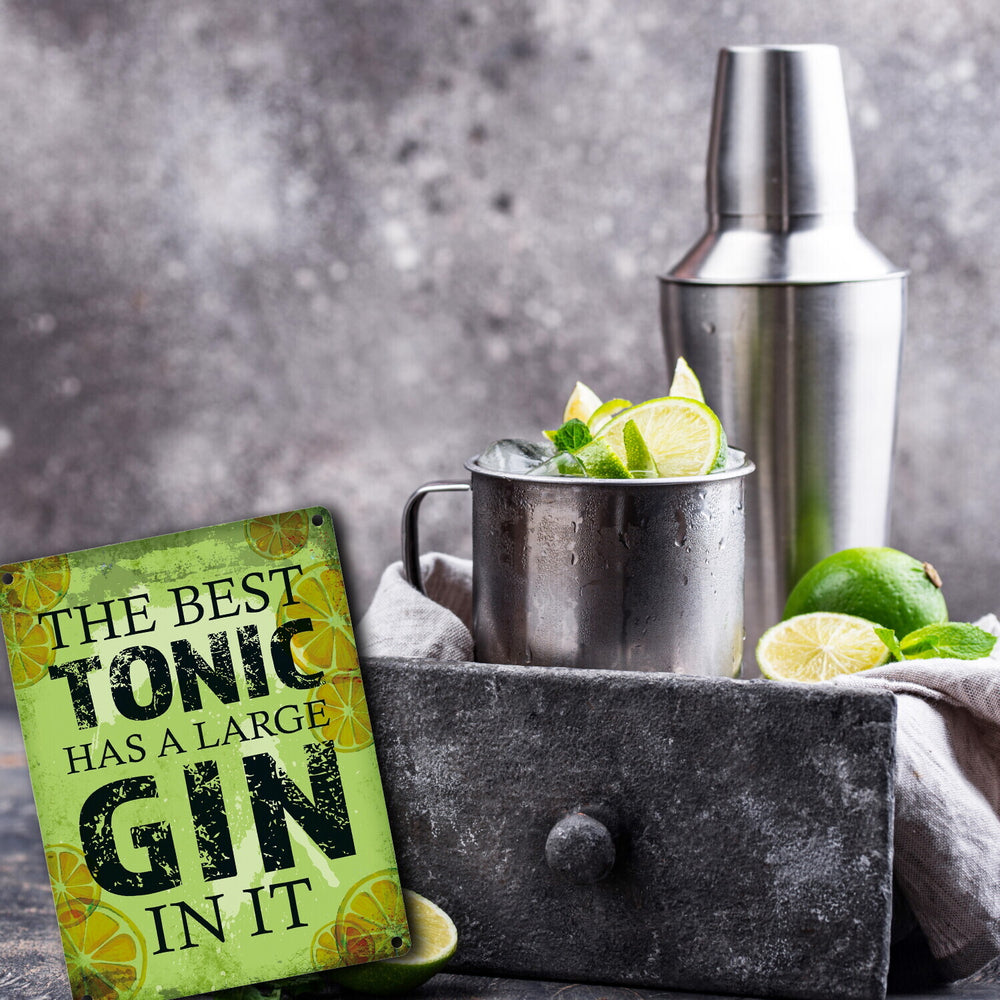 - 1x Metallschild mit Gin Tonic Motiv und Spruch: Best Tonic has Gin in it in der gewählten Größe
