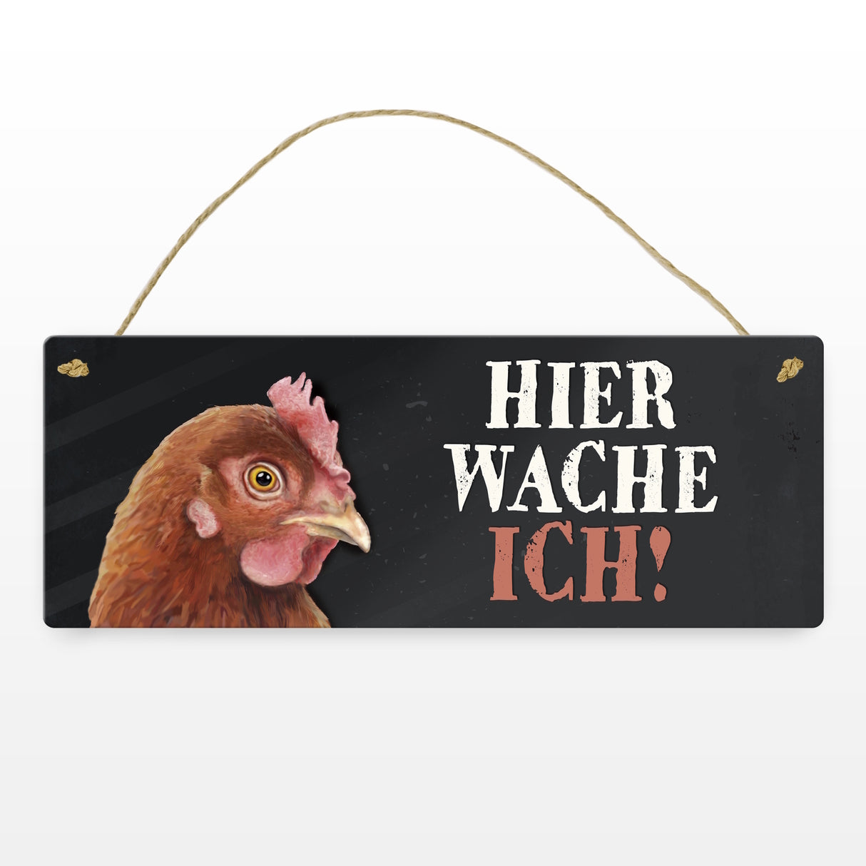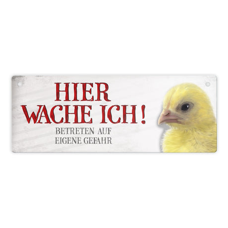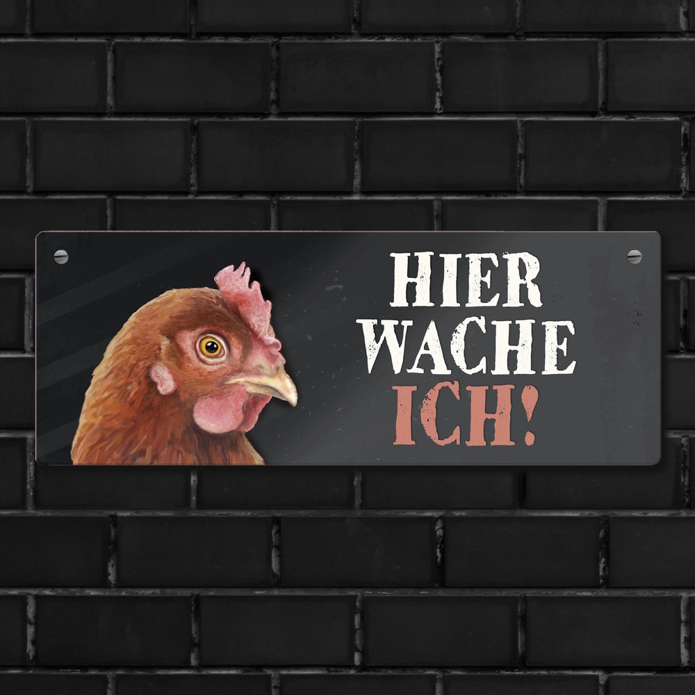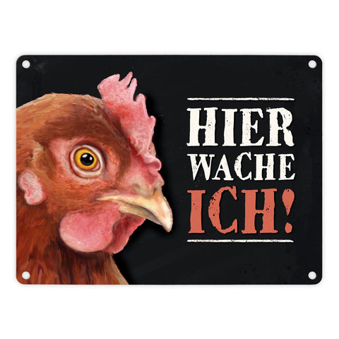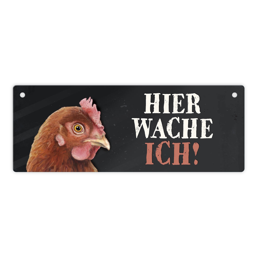 - Lieferumfang: 1x Metallschild mit Huhn Motiv und Spruch: Hier wache ich!