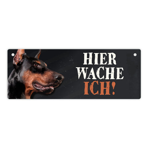 Metallschild mit Dobermann Motiv und Spruch: Hier wache ich!