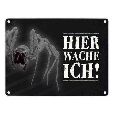 Metallschild mit Spinne Motiv und Spruch: Hier wache ich!