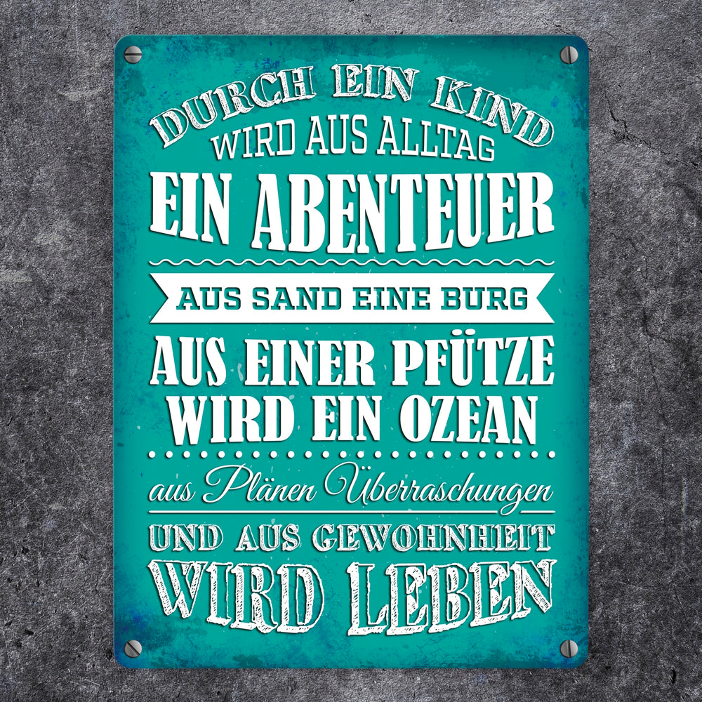 Metallschild mit Spruch: Durch ein Kind wir aus Alltag ...