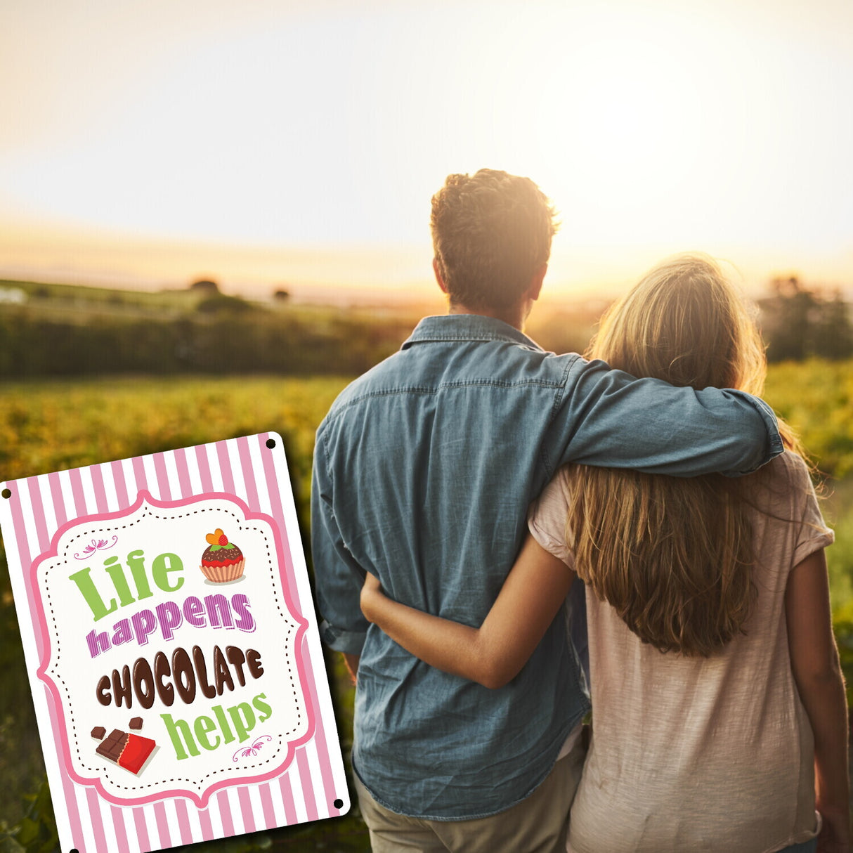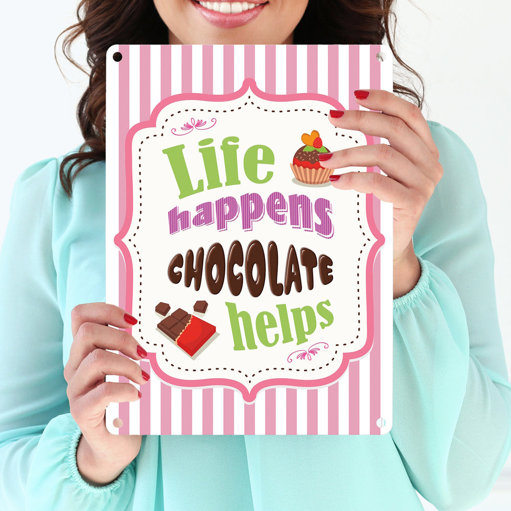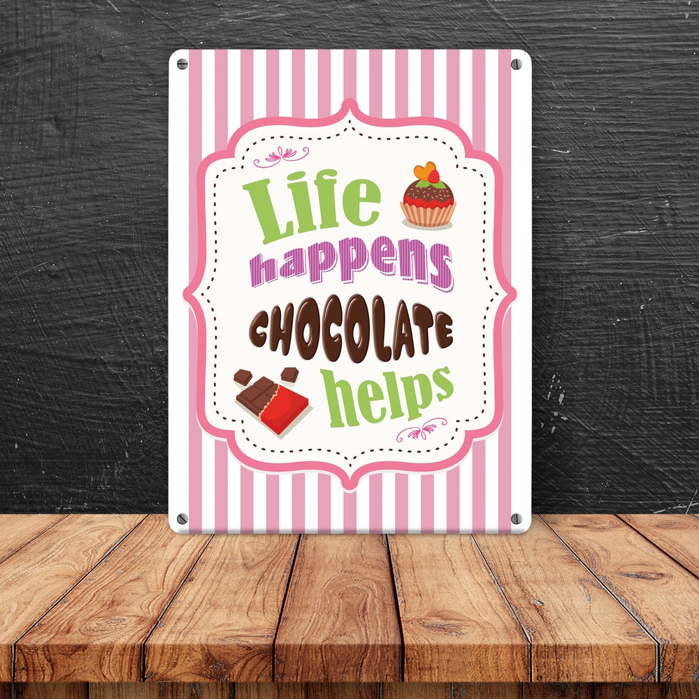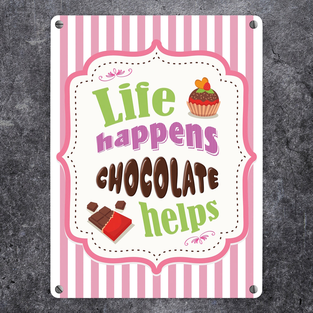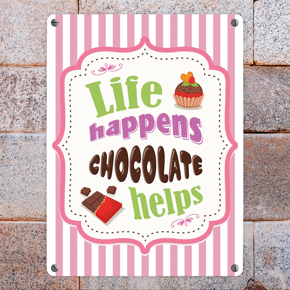 - 1x Metallschild mit Spruch: Life Happens - Chocolate Helps in der gewählten Größe