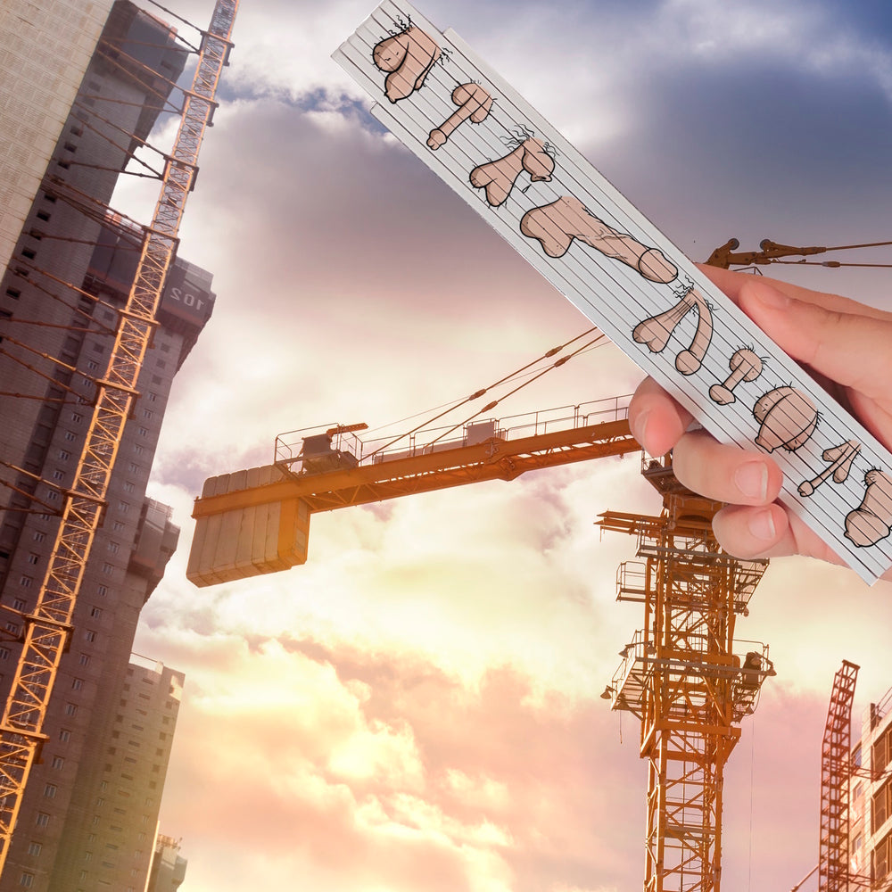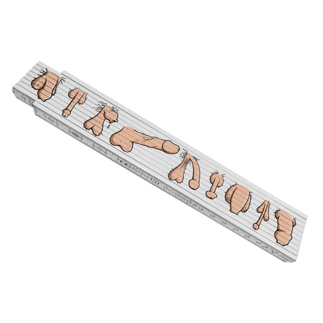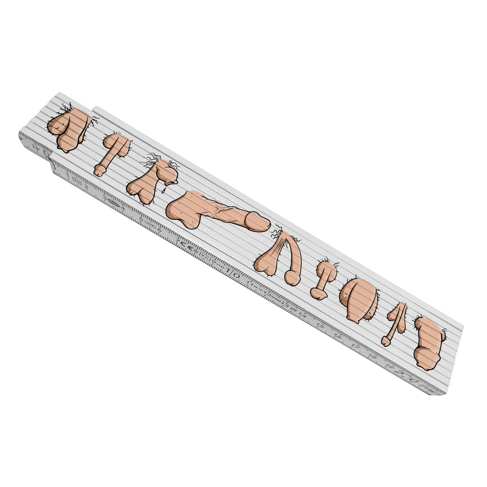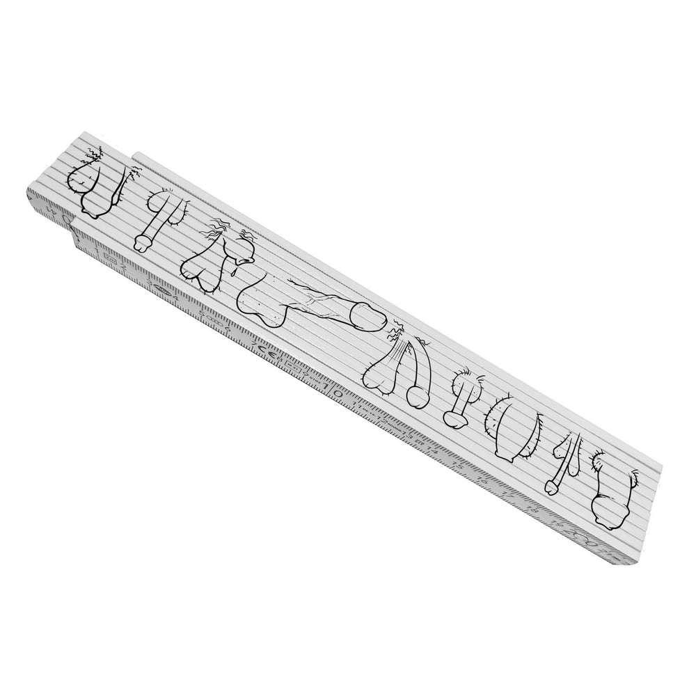 Meterstab aus Holz mit Penis Motiv - Verschiedene Glieder im bekannten Comic Stil