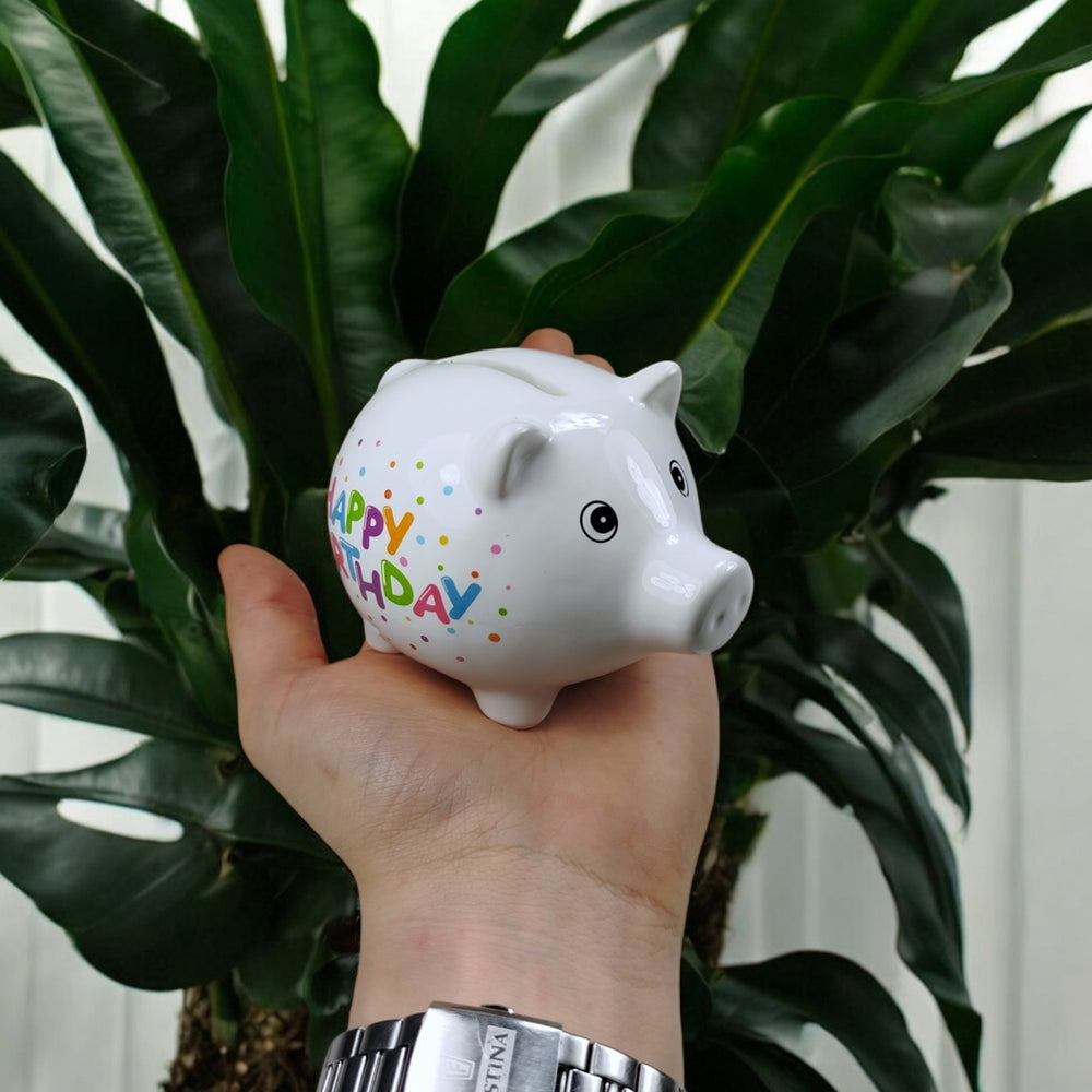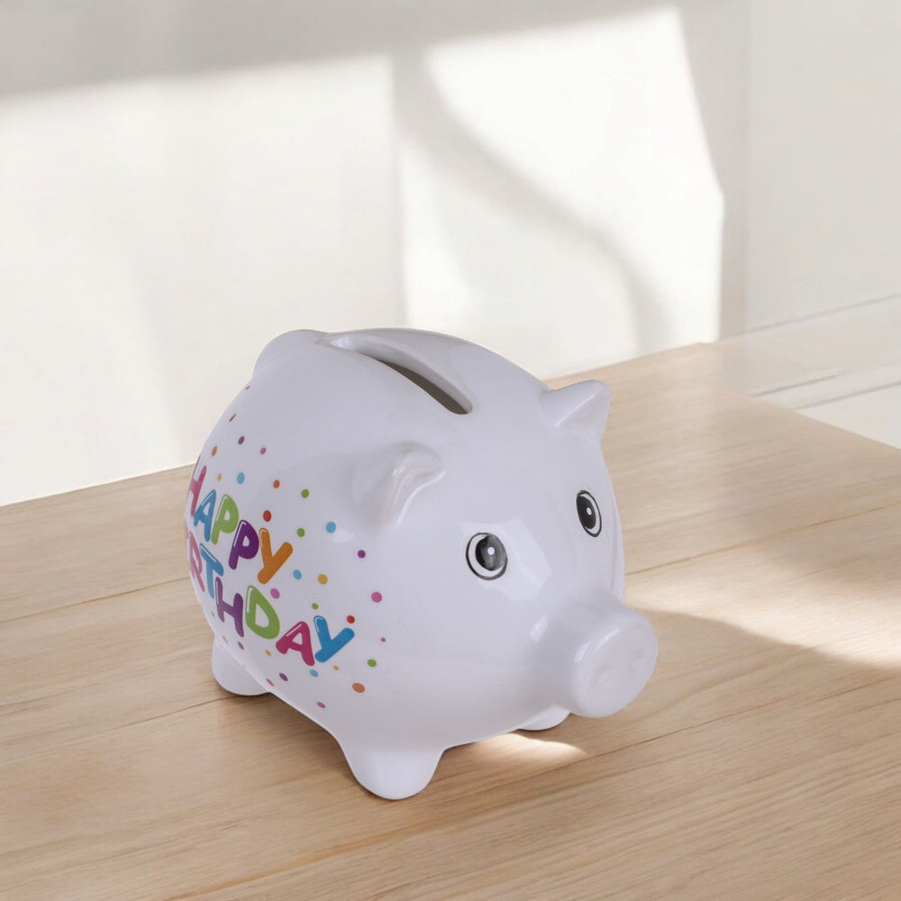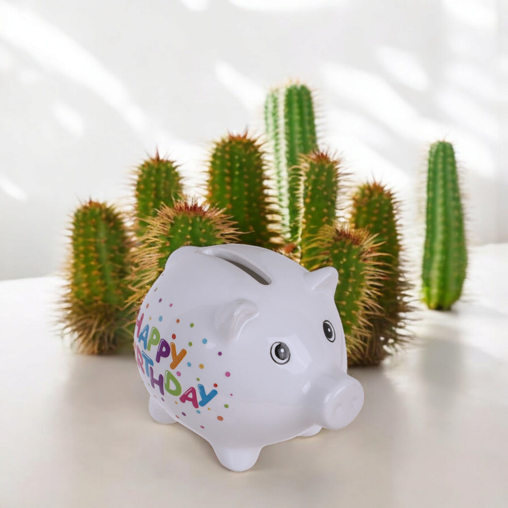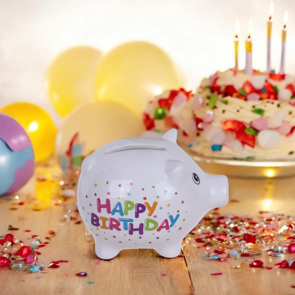 Feiern Sie Geburtstage fröhlich und finanziell clever mit dem Mini-Happy-Birthday-Sparschwein! Perfektes Geschenk für kreative Kinder, die spielend sparen lernen wollen. Material: Keramik