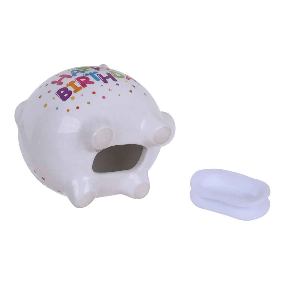- Dieses charmante Sparschwein aus Keramik besticht durch sein fröhliches Design: Der "Happy Birthday"-Schriftzug und bunte Punkte machen es zur perfekten Deko. Der Schlitz auf dem Rücken nimmt Münzen gerne entgegen, während der Kunststoffstopfen am Bauch sie sicher bewahrt, bis sie wieder gebraucht werden.