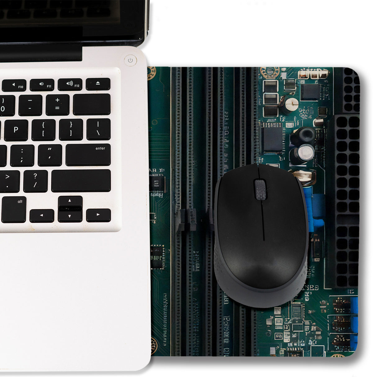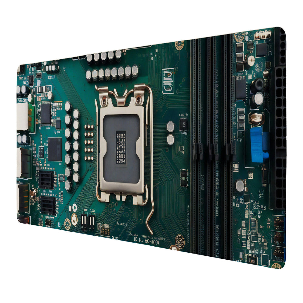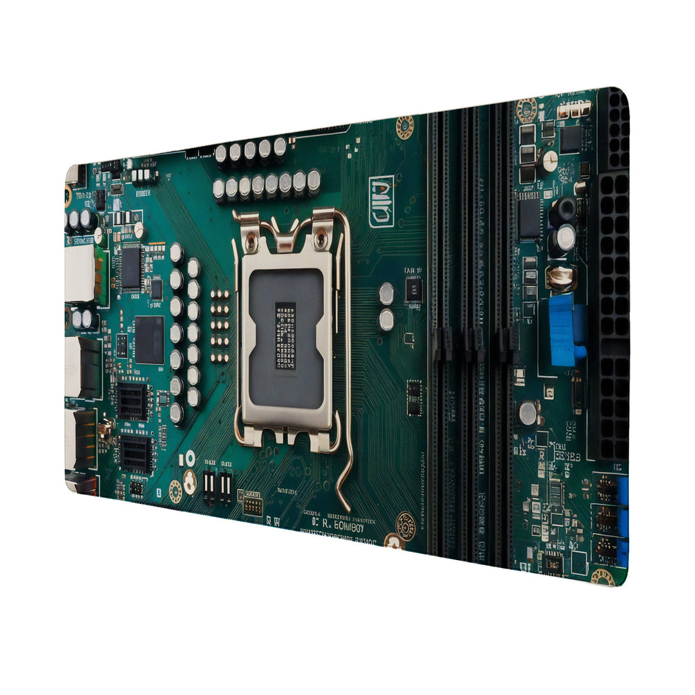 - Entdecken Sie die Motherboard Schreibtischunterlage mit technologischem Design! Mit einer Draufsicht auf ein grünes Motherboard bringt sie High-Tech-Stil auf Ihren Arbeitsplatz. Perfekt für Technikbegeisterte, die einen Hauch Computer-Chic wünschen, während sie über ihre täglichen Aufgaben brüten.