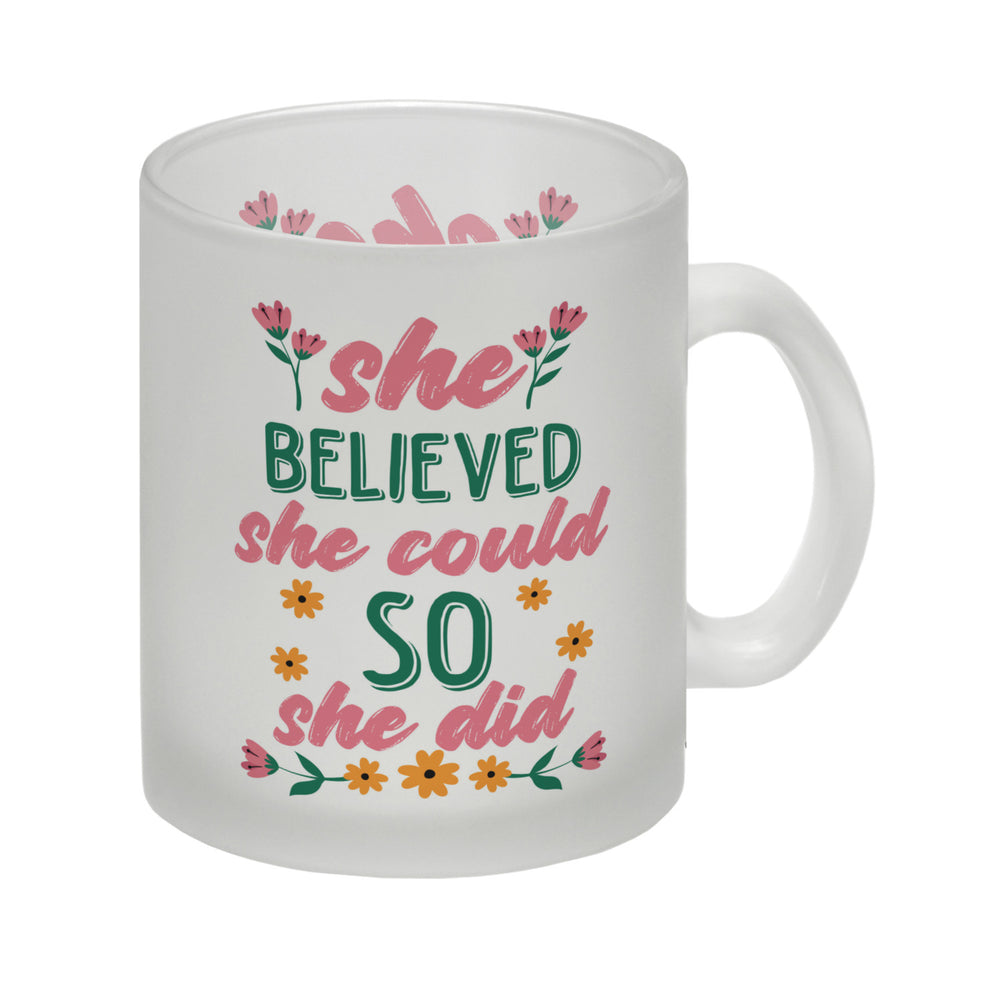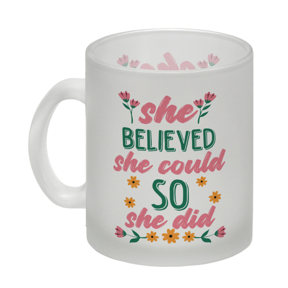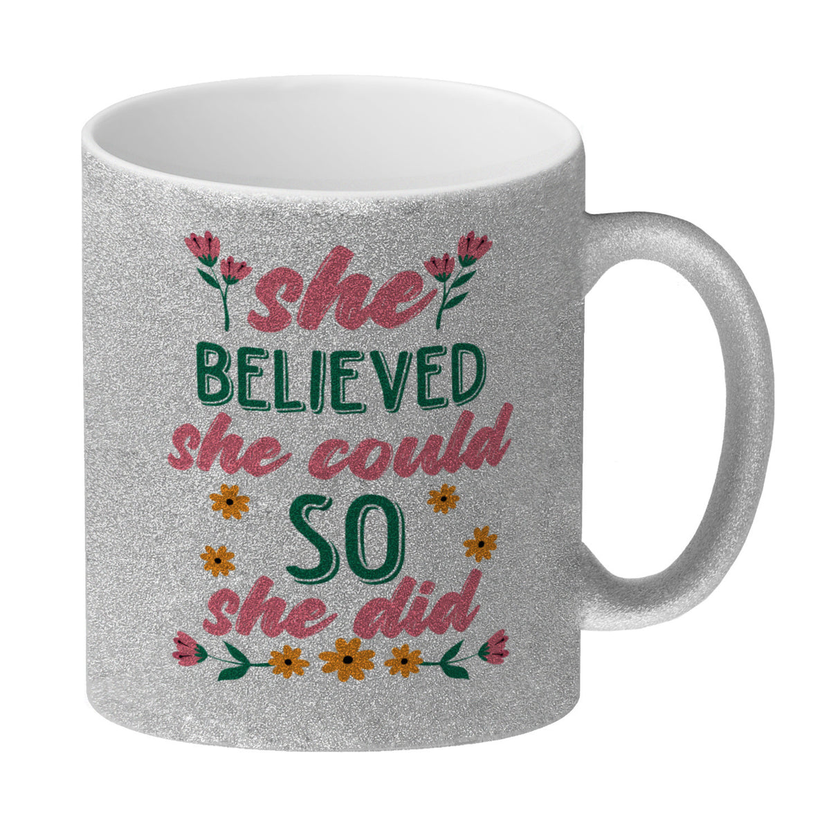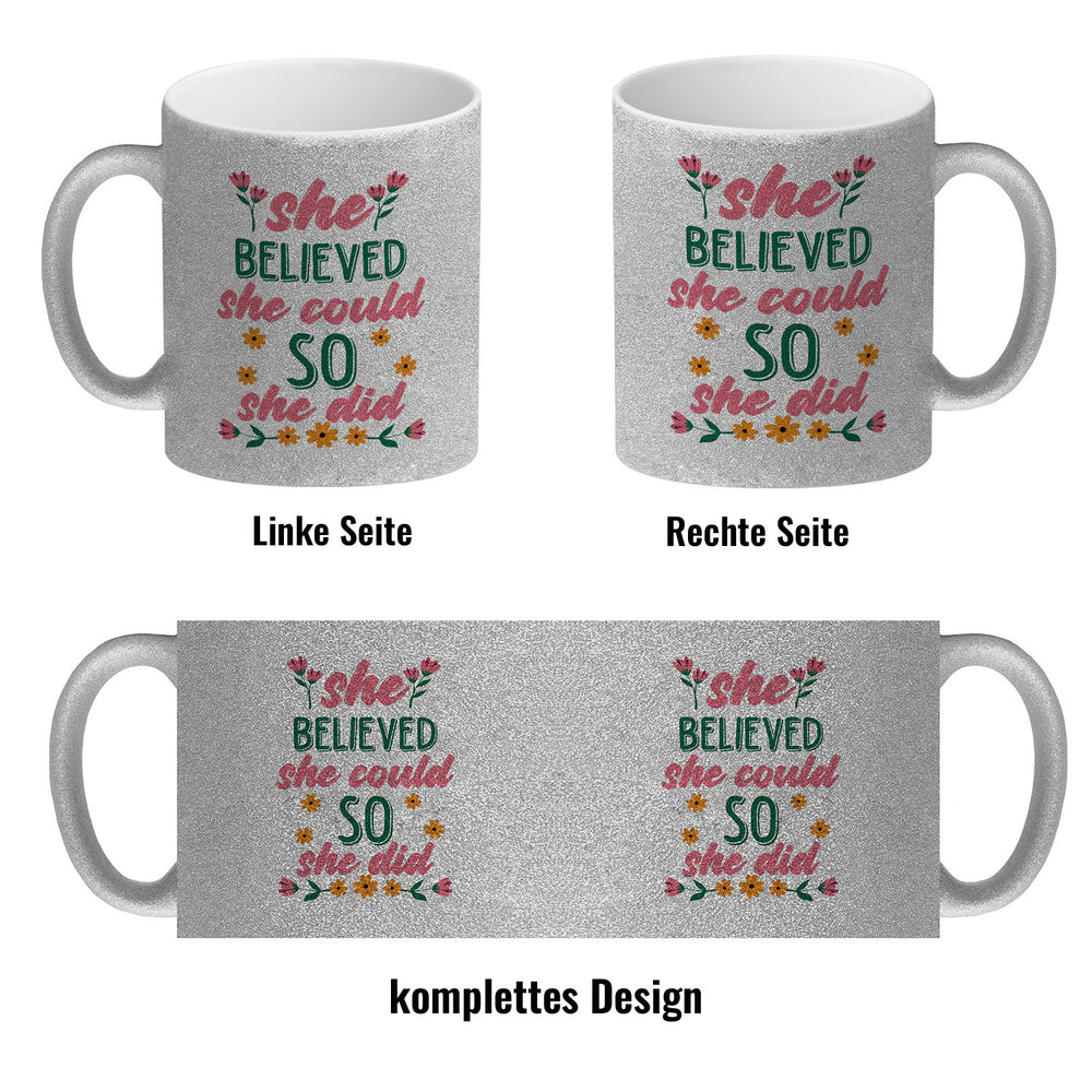Lassen Sie Ihre Liebsten mit unserem Motivation Kaffeebecher mit Spruch „She believed she could so she did“ wissen, dass Sie an sie glauben! Der schöne Kaffeebecher ist ein tolles Geschenk für Frauen und Mütter zum Geburtstag oder Muttertag. Er ist in verschiedenen Ausführungen erhältlich: als weiße Standardtasse, mit farbigem Henkel und Innenseite, als edle Glastasse oder in der exklusiven Silberedition mit Glitzereffekt. Jede Tasse wird mit Sorgfalt in Handarbeit hergestellt und ist somit ein Unikat. Der Kaffeebecher kann als Ermutigung und Inspiration für andere Menschen, aber auch als Stimmungsaufheller für Freundinnen oder Aufmunterung für Kolleginnen verwendet werden. Mit dem motivierenden Motiv erhalten sie immer eine angenehme Erinnerung an Mut und Stärke. Schenken Sie Ihren Liebsten unser Motivation Kaffeebecher mit Spruch She believed she could so she did - ein tolles Geschenk voller Aufmunterung und Inspiration!