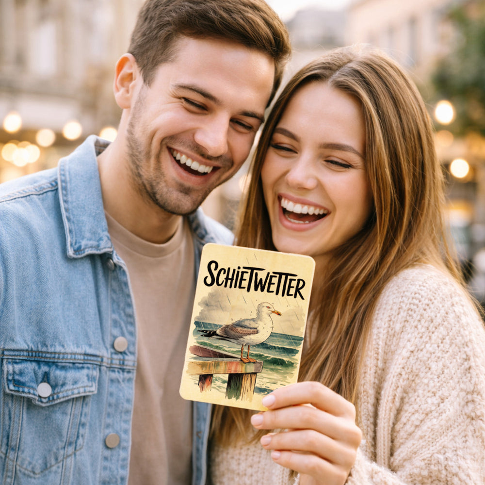 - Die Holzpostkarte zeigt eine bezaubernde Aquarellillustration einer einsamen Möwe, die sich im Regen tapfer auf einem verwitterten Holzgeländer hält. Ihr zerzaustes Gefieder und der stürmische Ozean im Hintergrund transportieren das herrlich norddeutsche Wetter als "SCHIETWETTER" in rustikalen Buchstaben. Ein sanfter, weißer Hintergrund mit Aquarellrändern umrahmt diese stimmungsvolle Küstenszene.