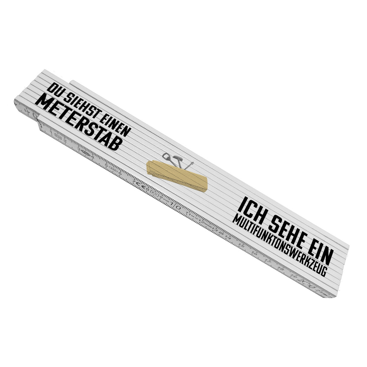 • Der Meterstab ist weiß und mit folgendem Spruch bedruckt. Du siehst einen Meterstab ich sehe ein Multifunktionswerkzeug. In der Mitte ist ein Meterstab mit aufgeklappten Werkzeugen abgebildet.