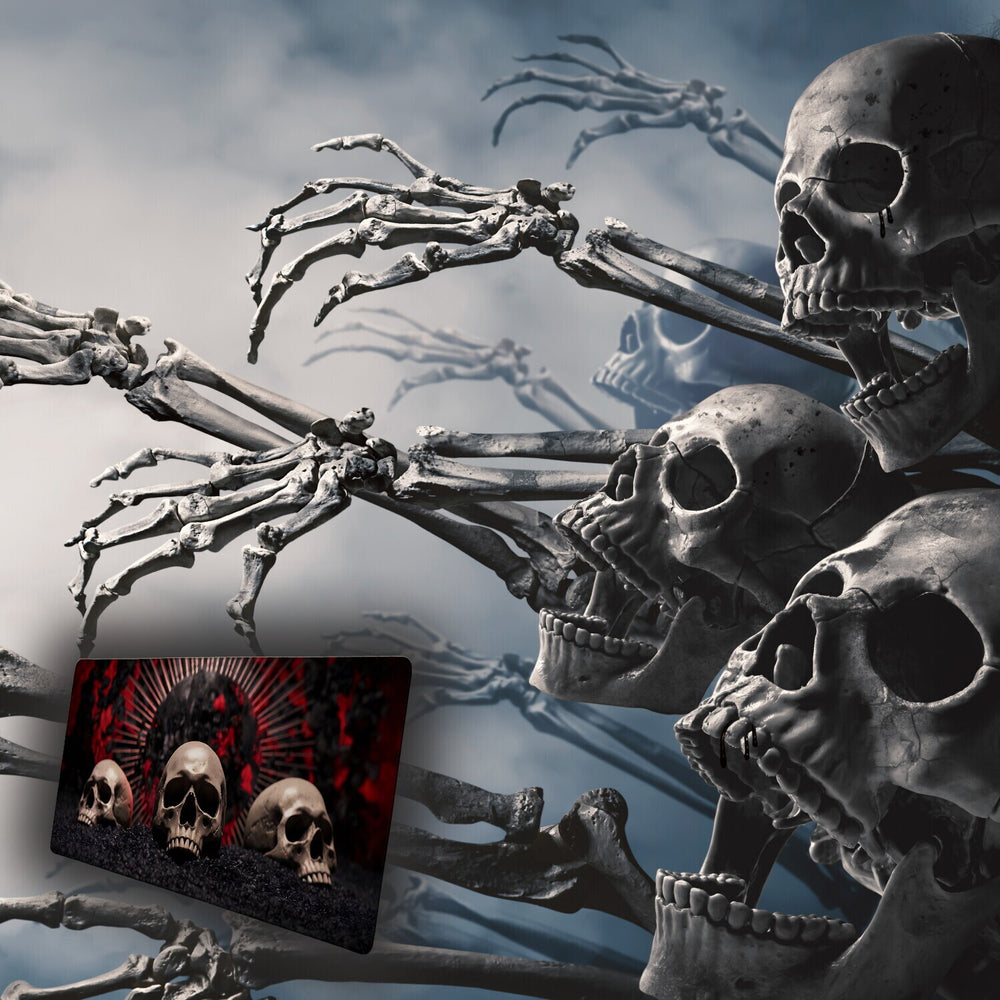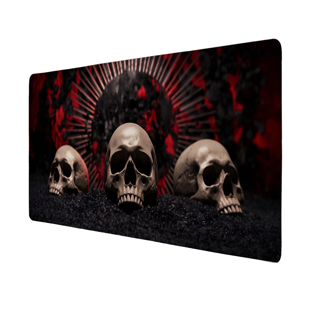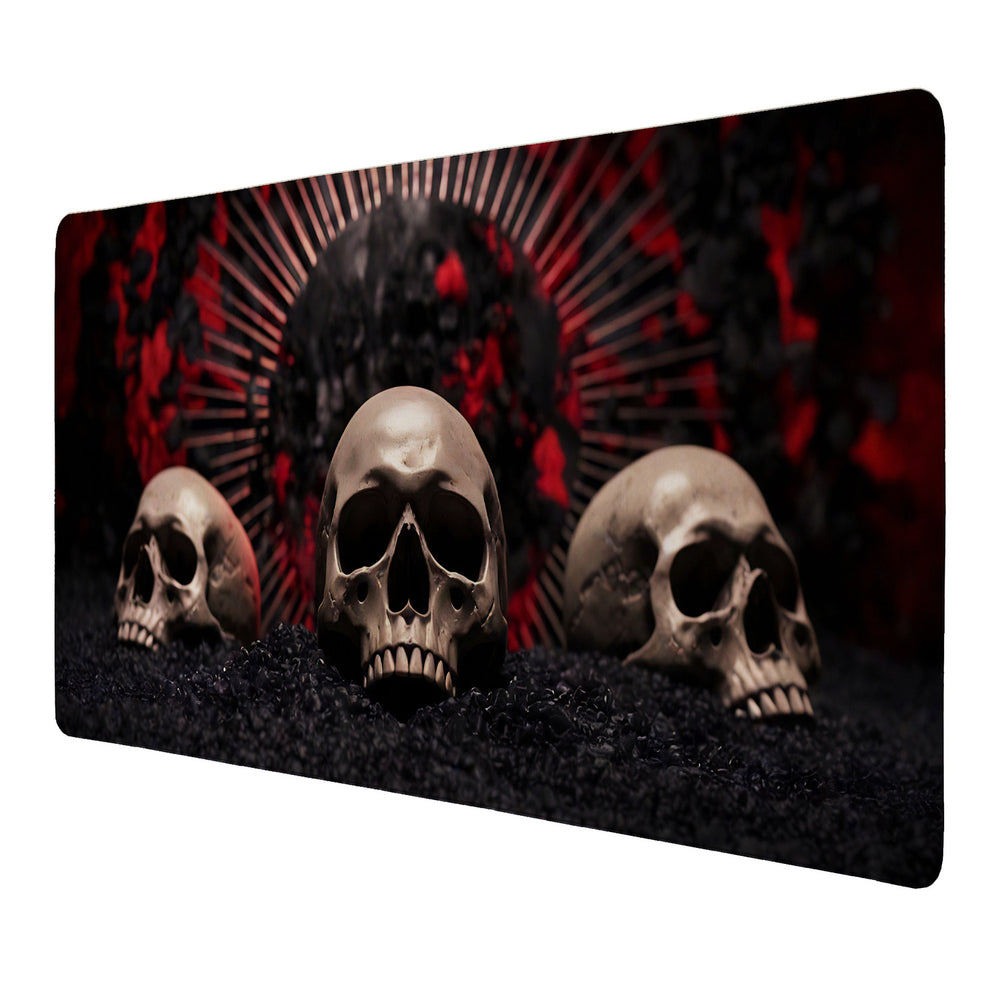 • Die unheimliche Schreibtischunterlage besticht durch ein mysteriöses Schädel-Design. Drei gruselige Schädel thronen auf dunkler Oberfläche, begleitet von einem leuchtenden, roten Kreis im Hintergrund. Die chaotische, unheimliche Stimmung zieht mit diesem geheimnisvollen Motiv alle Blicke auf sich und sorgt für eine düstere Arbeitsatmosphäre.