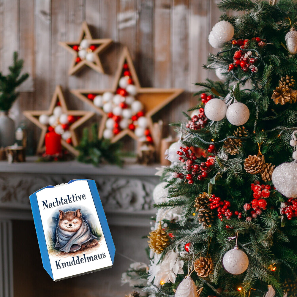 - Die Parkscheibe "Nachtaktive Knuddelmaus" bezaubert mit ihrem kuscheligen Fledermaus-Design auf einem weißen Hintergrund. In fröhlichem Aquarellstil werden eine schlafende Fledermaus und ein fuchsähnliches Wesen gezeigt, umhüllt von Decken. Der harmonische Mix aus Blau- und Grüntönen erinnert an eine sternenklare Nacht.