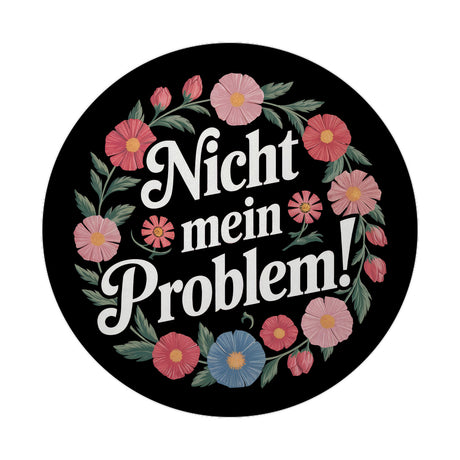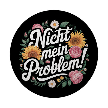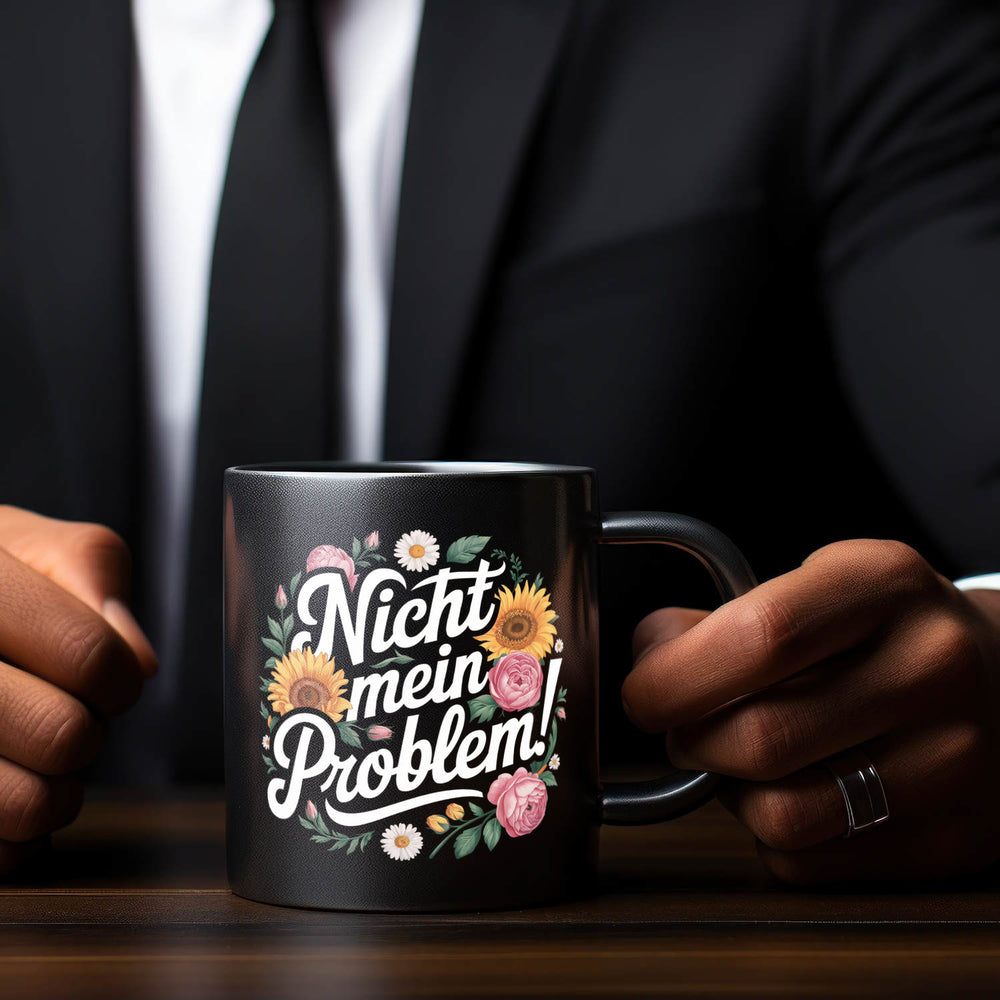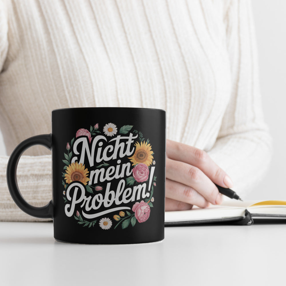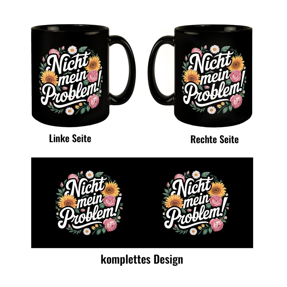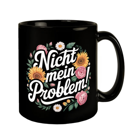 - Die Tasse erstrahlt in floraler Pracht mit rosa Rosen, gelben Sonnenblumen und weißen Gänseblümchen, die den witzigen deutschen Spruch "Nicht mein Problem!" umrahmen. In stilvoller, weißer Kursivschrift auf schwarzem Hintergrund vermittelt sie Gelassenheit und Stil in einem. Ideal für Büro und Zuhause!