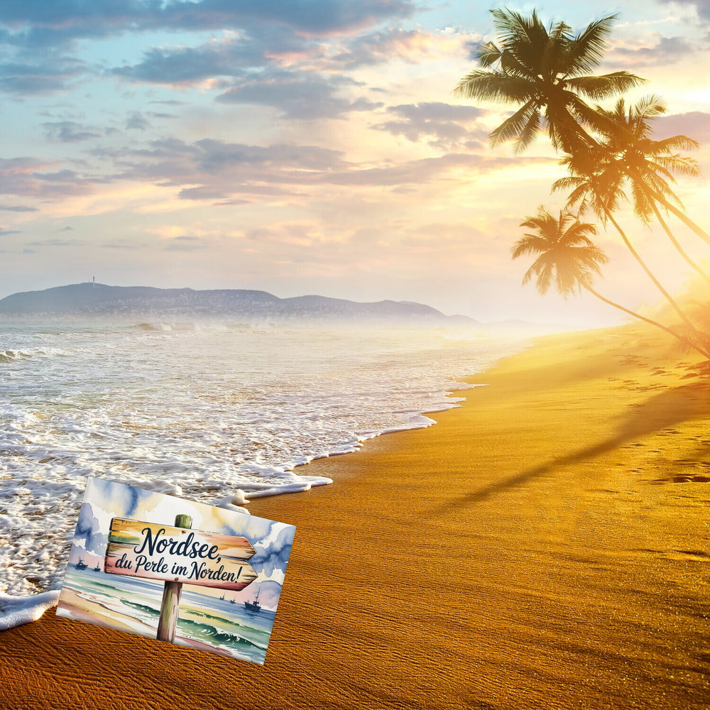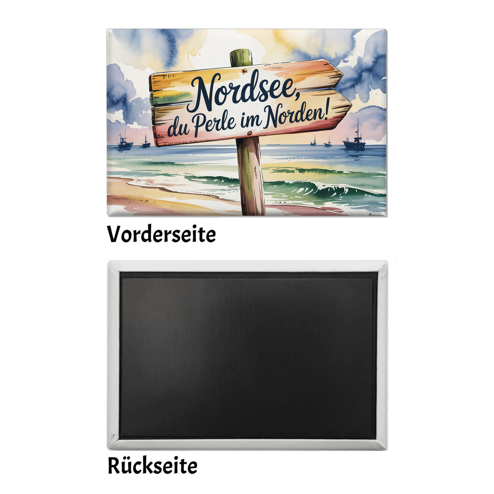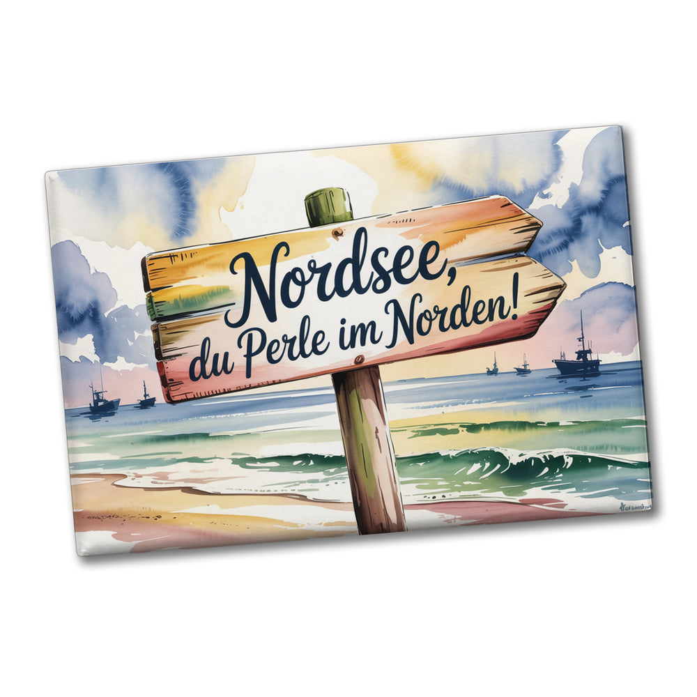 Der Magnet zeigt ein charmantes Aquarellbild der Nordseeküste mit weichem Sonnenlicht über einem bewölkten Himmel. Spruch: "Nordsee, du Perle im Norden!" auf einem rustikalen Holzwegweiser. Sanfte Wellen, ein sandiger Strand und entfernte Fischerb Hinweise: Größe: ca. 8x5,5 cm