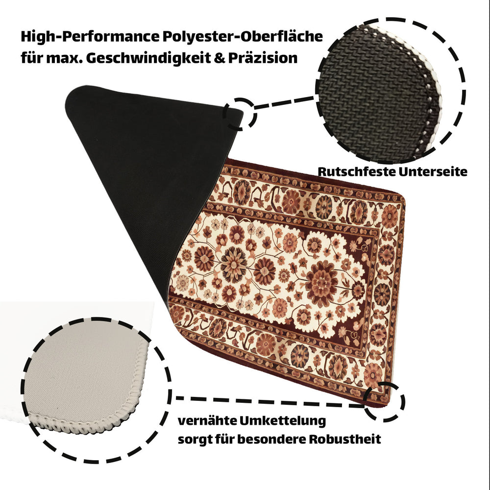- Tauchen Sie ein in die Welt von 1001 Nacht mit unserer orientalischen Teppich Schreibtischunterlage. Mit ihren kunstvollen floralen Mustern in tiefem Burgunderrot, umrahmt von goldenen und beigen Akzenten, verwandelt sie jeden Schreibtisch in ein Märchenreich. Wer hätte gedacht, dass Büroarbeit einen Hauch von Magie haben kann?
