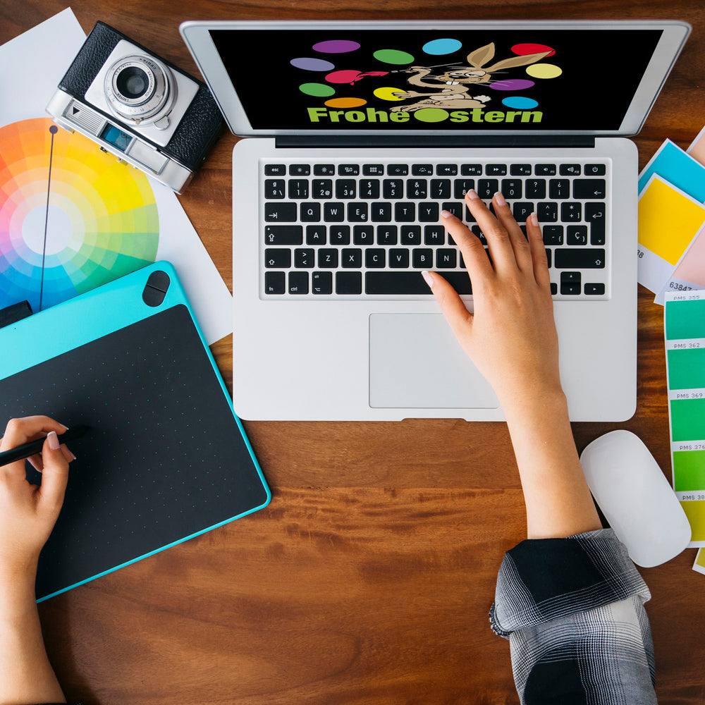 - Die lustige Osterhase Tasse in edlem Schwarz zeigt einen niedlichen Hasen, der mit einem Pinsel ein buntes Ei bemalt. Im Hintergrund zieren bunte Ostereier die Szenerie. Der fröhliche Spruch "Frohe Ostern" rundet das festliche Design ab und bringt ein Lächeln auf jedes Gesicht.