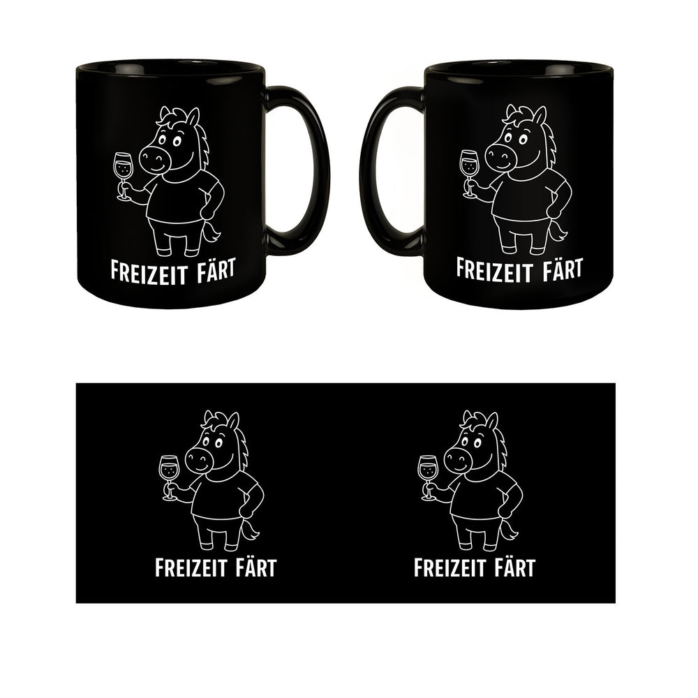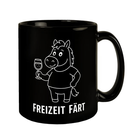 Diese witzige Tasse zeigt ein cartoonartiges Pferd in Weiß auf schwarzem Grund, das mit einem Glas Wein in der Hand fröhlich lächelt. Der freche Spruch „FREIZEIT FÄRT“ steht in fetten, weißen Buchstaben darunter und bringt garantiert gute Laune in jeden M Hinweise: Fassungsvermögen: ca. 300ml