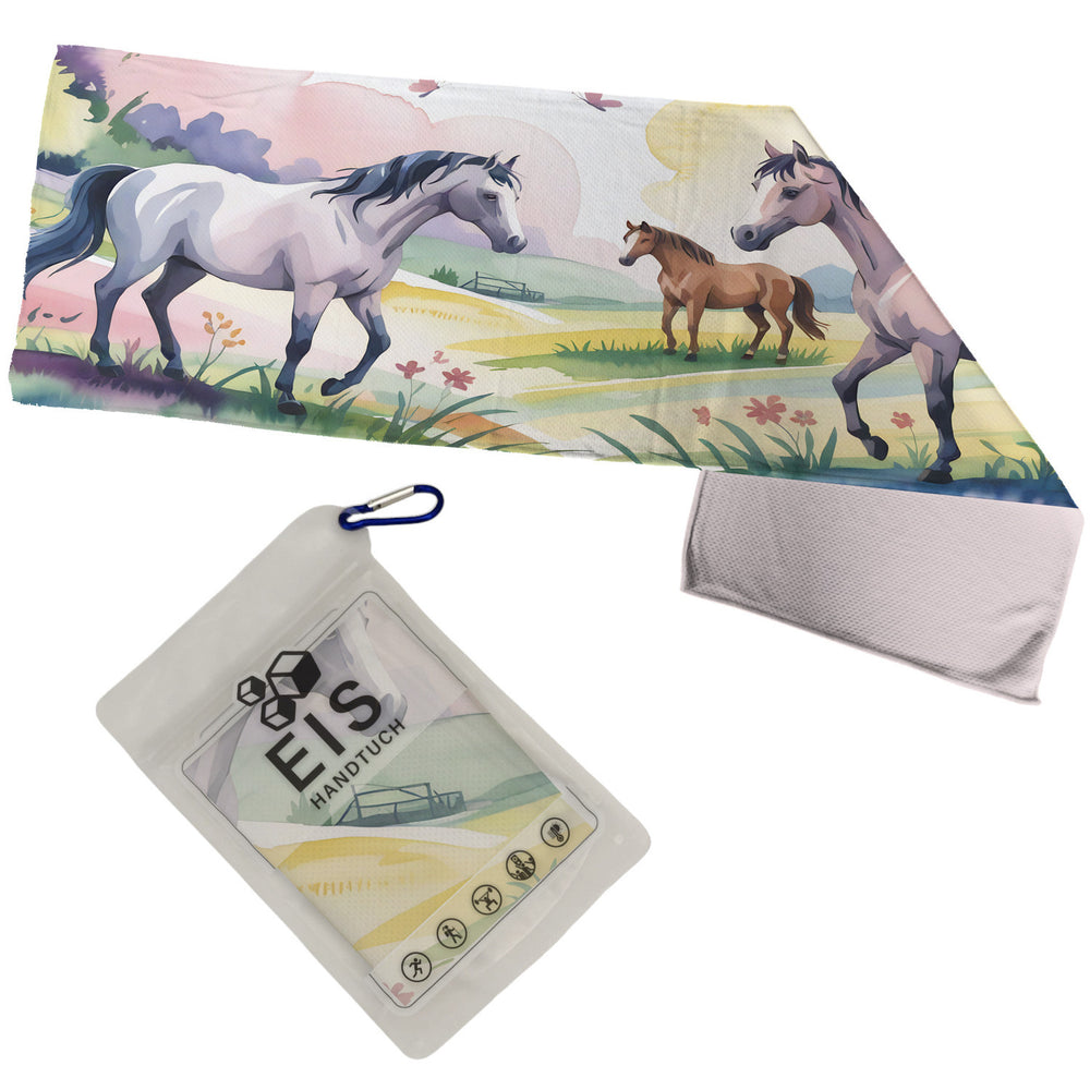- Dieses zauberhafte Eishandtuch zeigt ein wunderschönes Aquarelldesign mit Pferden für Mädchen. In Pastelltönen von Rosa, Flieder und Himmelblau gleiten die Pferde anmutig durch eine friedliche Wiese. Zarte Blumen und Schmetterlinge vollenden die magische Szene, die Ruhe und Fantasie weckt.