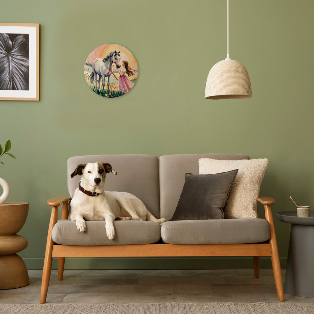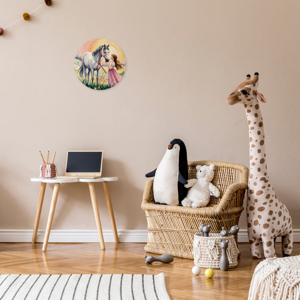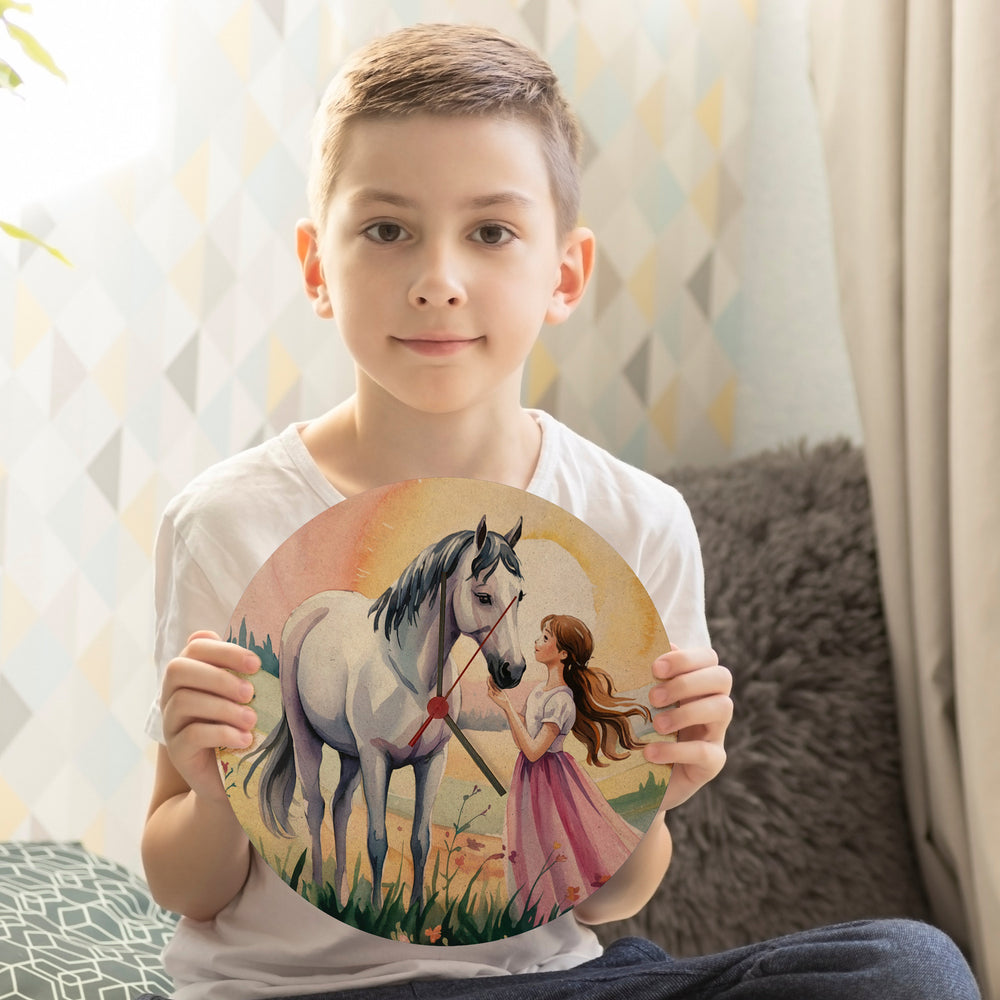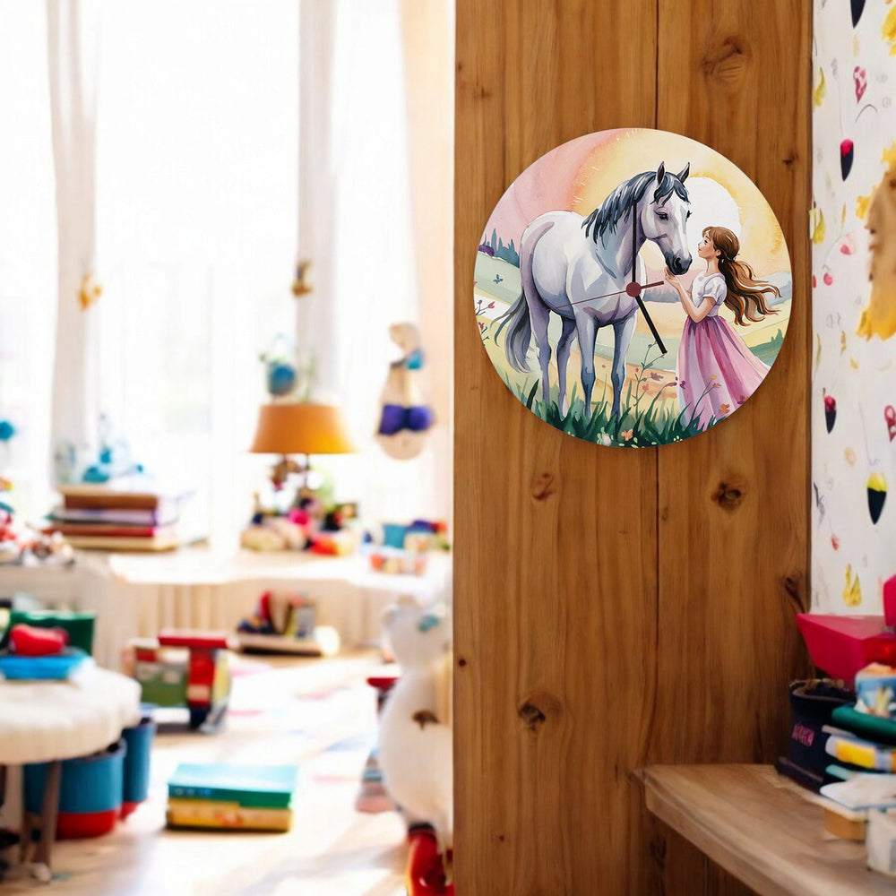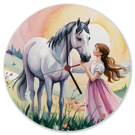 - Diese Wanduhr ist ein Kunstwerk! Mit einem verträumten Aquarellmotiv in zarten Pastelltönen zeigt sie ein Mädchen und sein weißes Pferd in einer zauberhaften Szene bei Sonnenuntergang. Umrahmt von zarten Blumen und Schmetterlingen, ist sie ein Blickfang für jedes Zimmer.