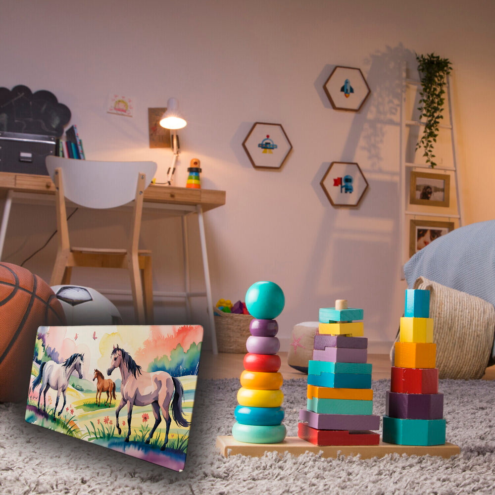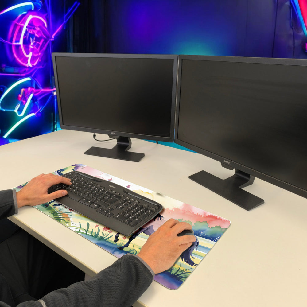 - Die Schreibtischunterlage zeigt ein bezauberndes Aquarelldesign mit Pferden, die anmutig über eine Blumenwiese laufen. In sanften Pastelltönen von Rosa, Flieder und Himmelblau, umgeben von flatternden Schmetterlingen, entsteht eine friedliche Landschaft. Perfekt für junge Pferdeliebhaberinnen, die eine Prise Magie auf ihren Schreibtisch bringen wollen!