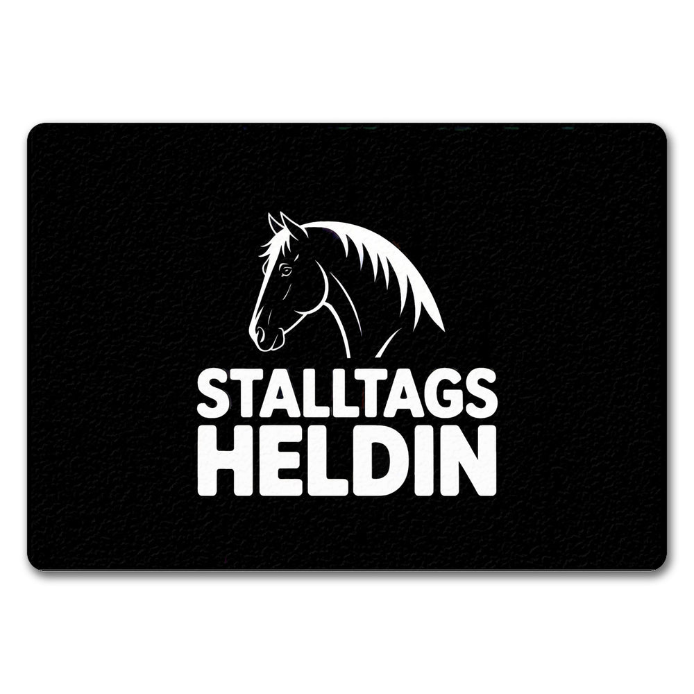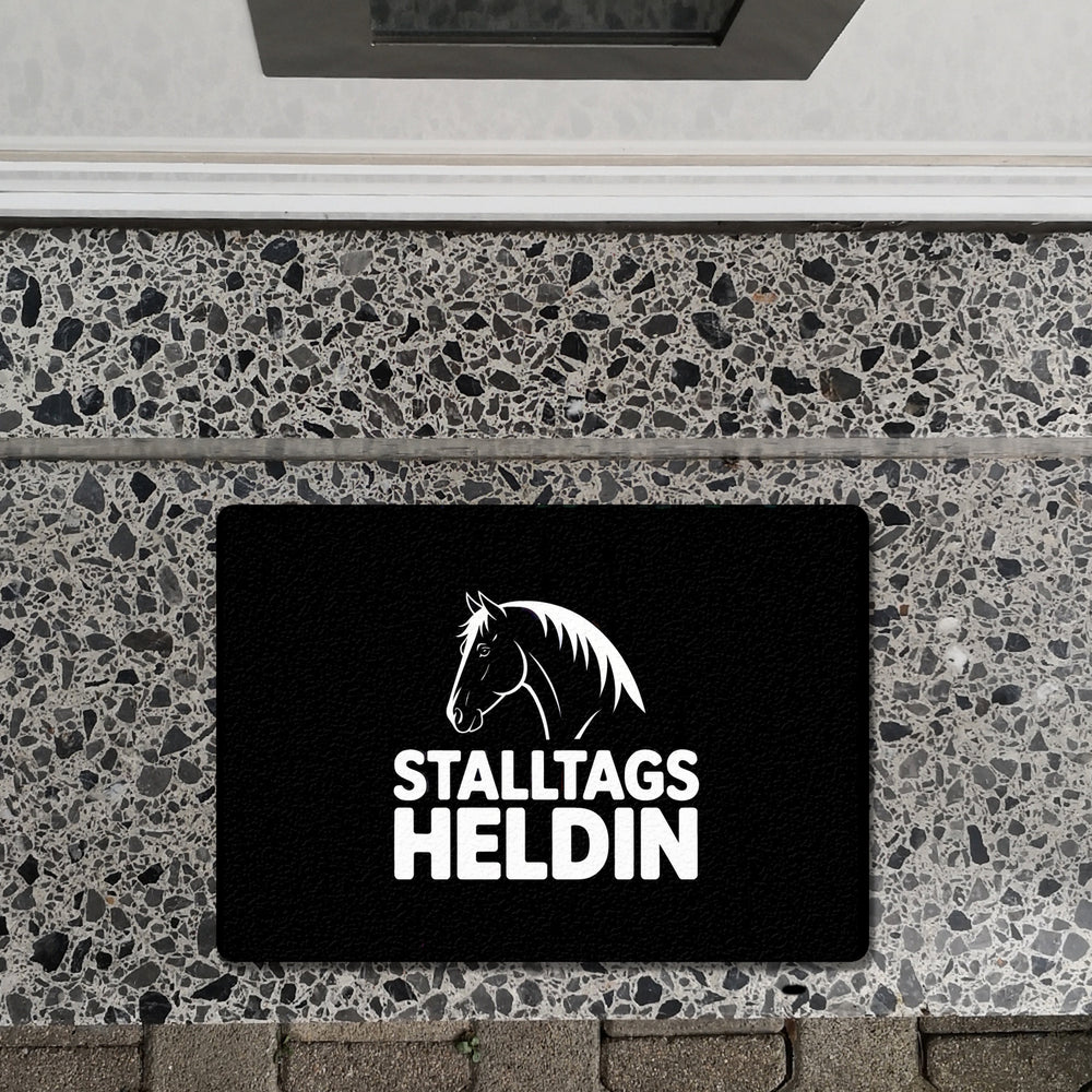 - Diese lustige Fußmatte zeigt eine elegante Pferdesilhouette auf einem schwarzen Hintergrund. Der weiße Text "Stalltags Heldin" sticht hervor und gibt der Matte einen humorvollen Touch. Perfekt für alle Reiterinnen, die stolz auf ihre Leidenschaft sind!