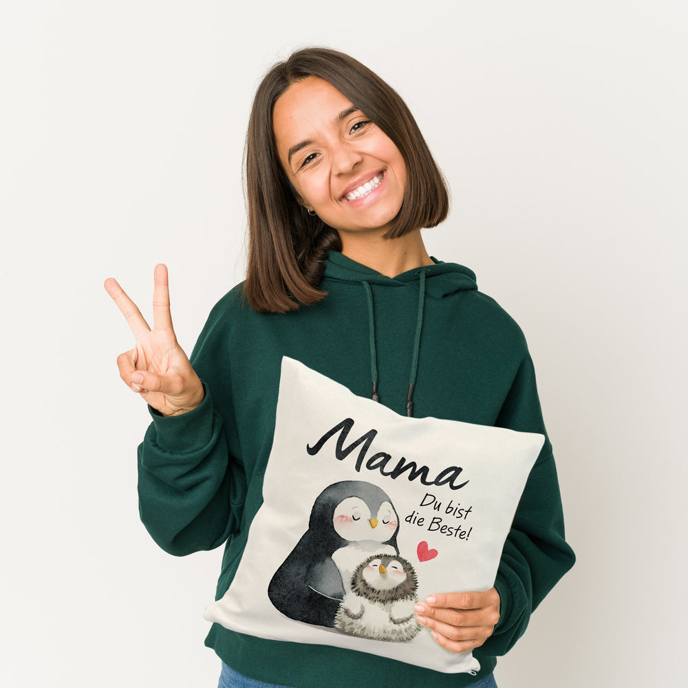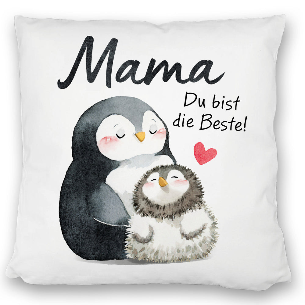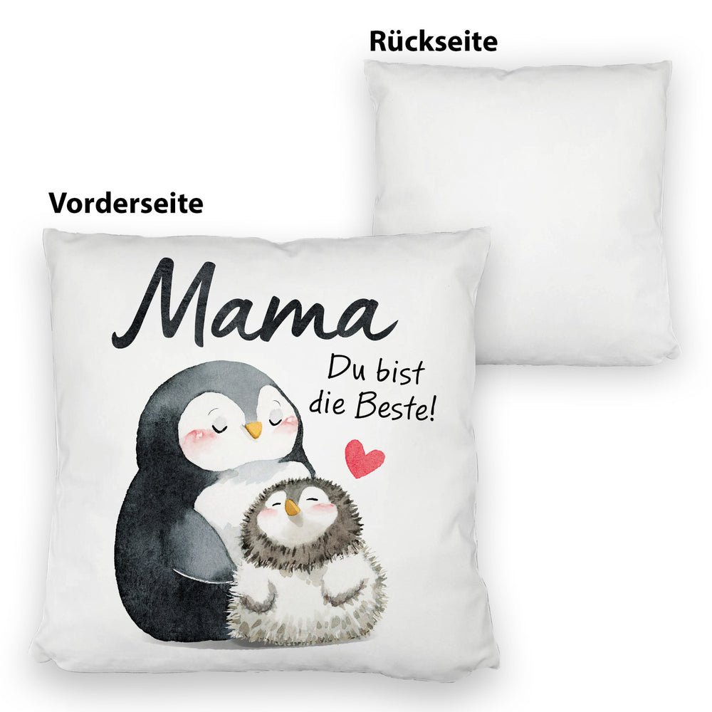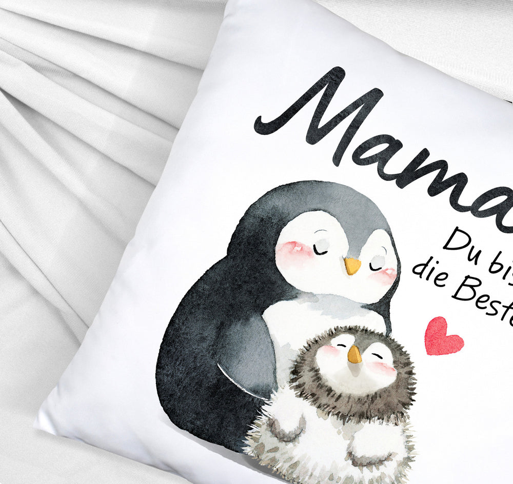 - 1x Pinguin Mutter und Kind Kissen mit Spruch Mama du bist die Beste in der gewählten Ausführung
