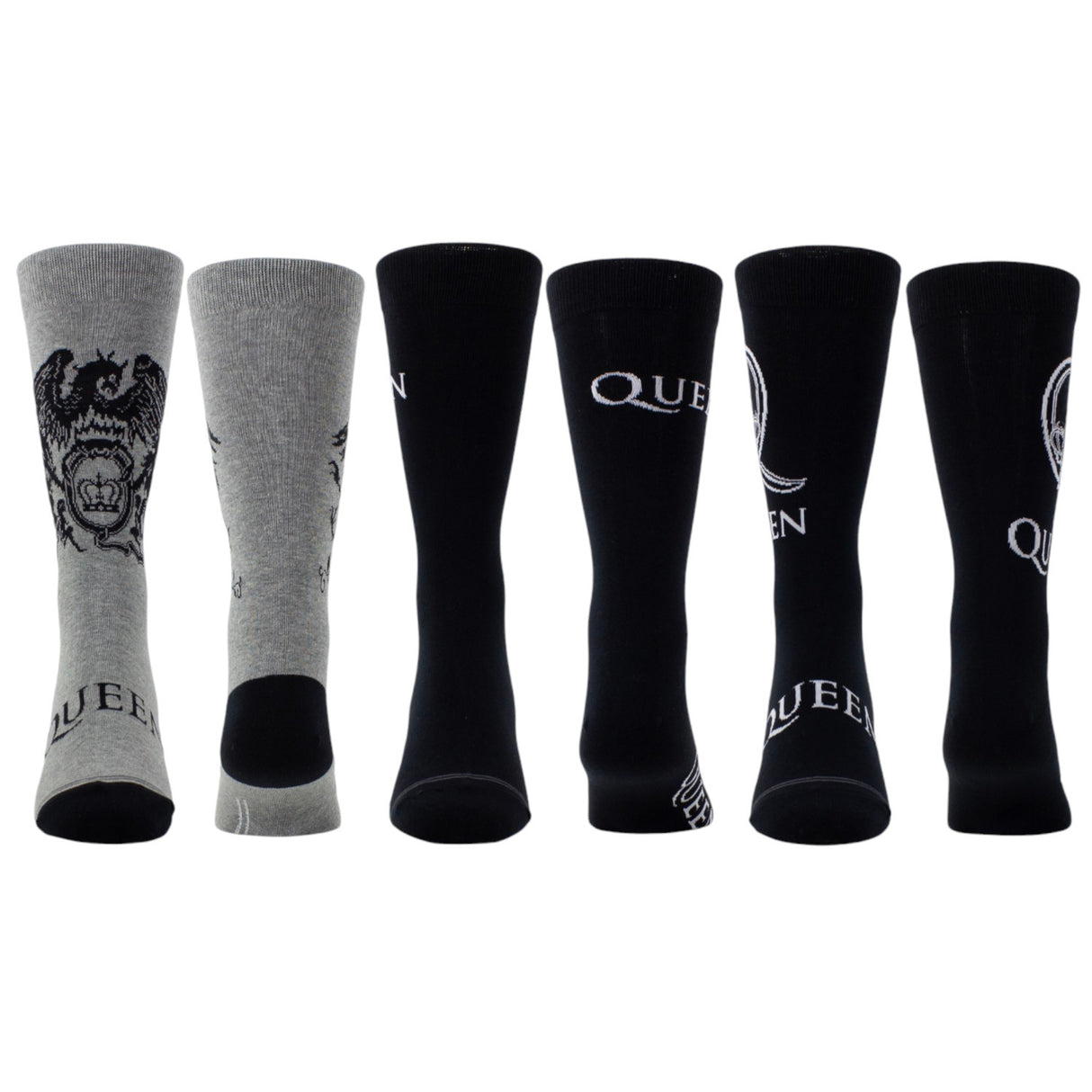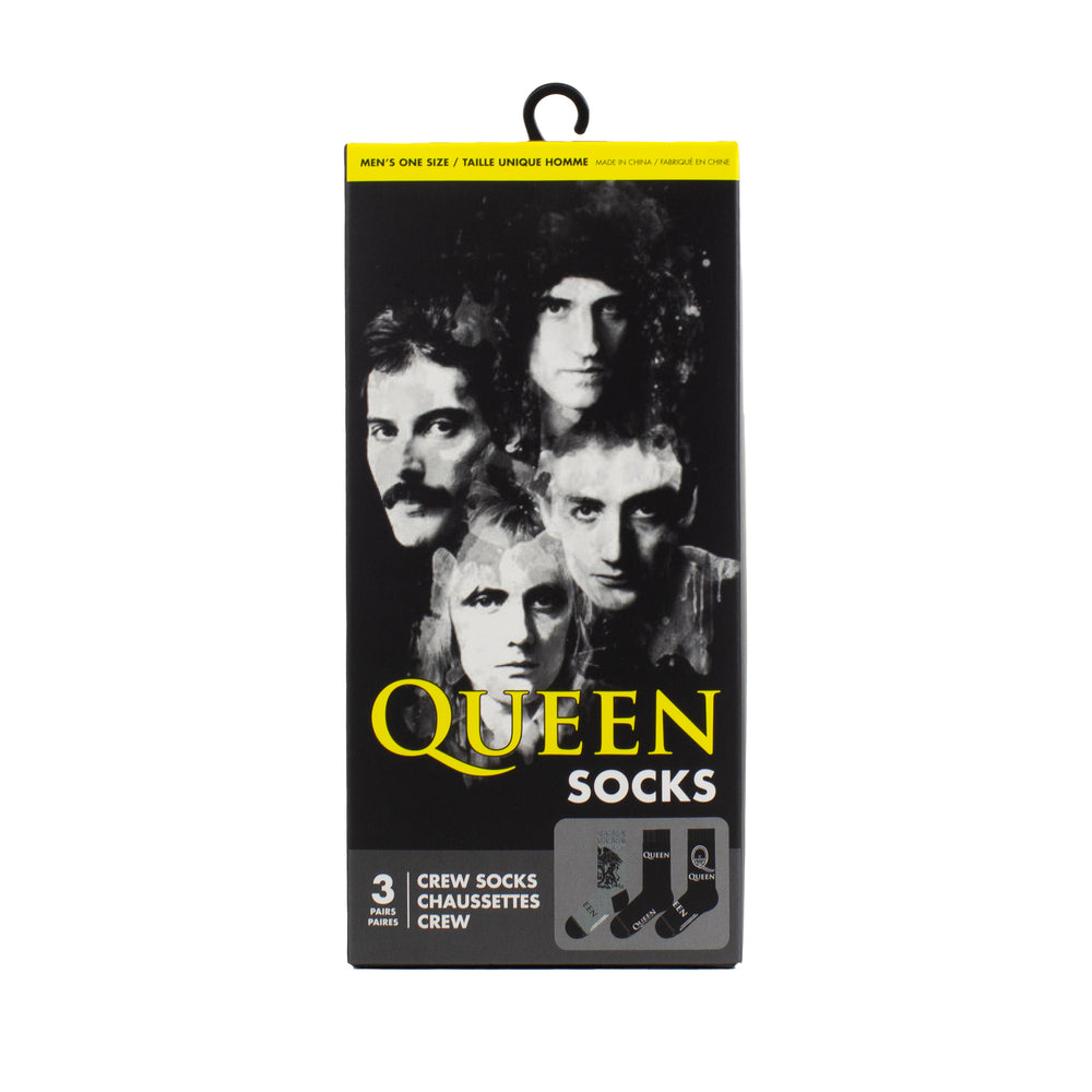 - Dieses Set aus 3 Paar Socken hat ein Design, das sich sehen lassen kann: Zwei Paare strahlen im klassischen Weiß, während das Dritte in einem edlen Grau die Bühne betritt. Das ikonische Queen-Logo und der Schriftzug tanzen in verschiedenen Farben und Größen über die Socken und machen sie zu einem absoluten Hingucker!