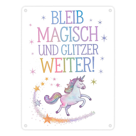 Einhorn mit Regenbogenmähne Metallschild in 15x20 cm Bleib magisch, glitzer weiter