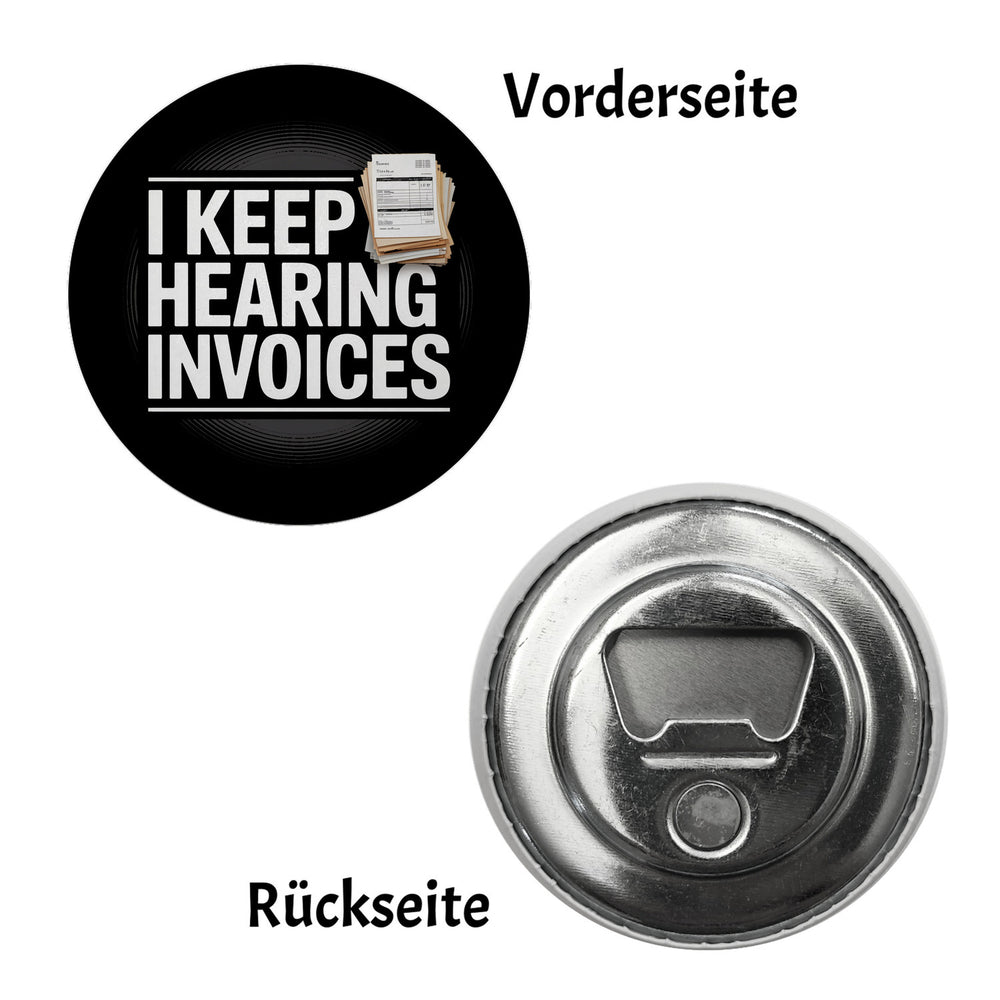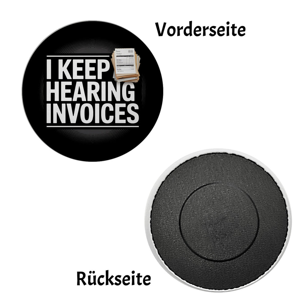 - Dieser runde Magnet zeigt ein humorvolles Design mit dem Text "I KEEP HEARING INVOICES". Der schwarz-weiße, typografische Magnet besticht durch seine klare, serifenlose Schrift und einem chaotischen Stapel alter Rechnungen. Ein radialer Verlauf verleiht Tiefe, während der dramatische Kontrast für visuelle Spannung sorgt.