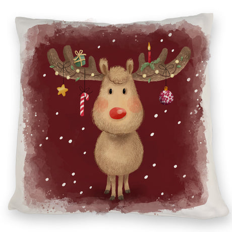 Rentier mit Weihnachtsschmuck Kissen mit rotem Hintergrund