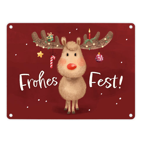 Rentier mit Weihnachtsschmuck Metallschild in 15x20 cm mit Spruch Frohes Fest