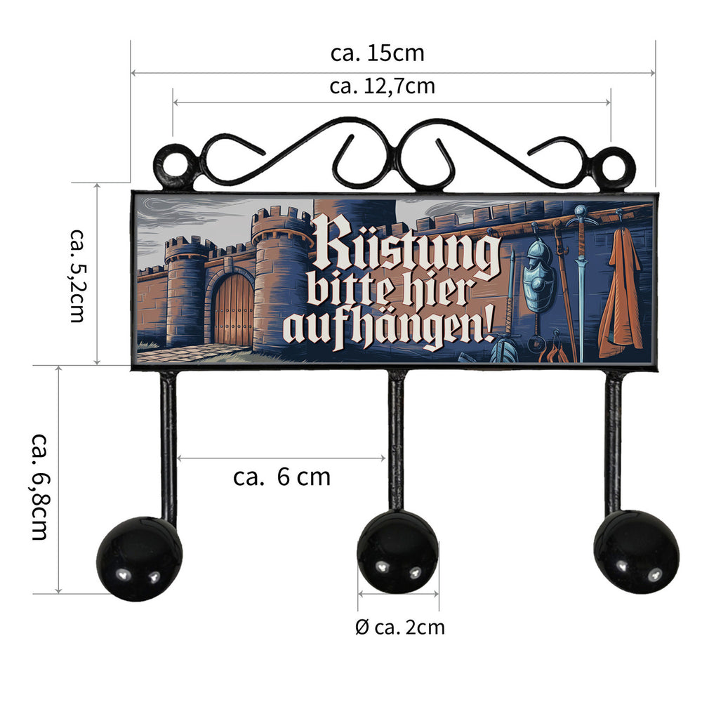 Willkommen in Ihrem privaten Schlossabenteuer! Die Rüstung Bitte Hier Aufhängen Kleiderhaken Leiste entführt Sie in eine Welt voller Ritter, Burgen und edler Damen. Mit dieser Kleiderhakenleiste wird Ihr Flur zur imposanten Empfangshalle einer mittelalterlichen Festung. Auf der Leiste prangt eine detaillierte Darstellung einer trutzigen Burg, umgeben von dramatischen Wolken und stattlichen Rüstungen, die sich rund um das große Tor versammeln. Der humorvolle Spruch Rüstung bitte hier aufhängen ist in stilechten, mittelalterlichen Buchstaben gehalten und sorgt garantiert für ein Schmunzeln beim Anblick.Mit drei perfekt angeordneten Haken bietet dieses kreative Schmuckstück nicht nur Platz für Mäntel und Hüte, sondern verleiht jedem Raum einen Hauch von Geschichte. Egal, ob im Flur, Schlafzimmer oder Büro – jeder Ort wird durch diesen Eye-Catcher in einen Schauplatz für mittelalterliche Heldentaten verwandelt.Dieses dekorative Highlight ist perfekt für Liebhaber des Mittelalters, Geschichtsfanatiker oder diejenigen, die einfach einzigartige Dekorationen schätzen. Verschenken Sie nicht nur einen praktischen Gegenstand, sondern eine Einladung zu abenteuerlichen Fantasien, die jeden Raum schmücken und erstrahlen lassen. Denn wer sagt, dass der Alltag nicht auch ein kleines Abenteuer sein kann? Also, schnappen Sie sich Ihren Mantel und hängen Sie Ihre moderne Rüstung mit Stil auf!