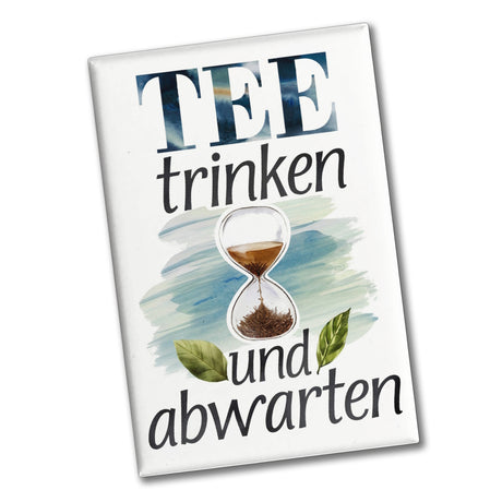 Dieser rechteckige Magnet zeigt eine Sanduhr, die statt mit Sand mit Teeblättern gefüllt ist. Der leere obere Teil symbolisiert Geduld. Der Spruch "Tee trinken und abwarten" in großen TEE-Buchstaben und sanften Aquarellfarben schafft eine beruhige Hinweise: Größe: ca. 8x5,5 cm