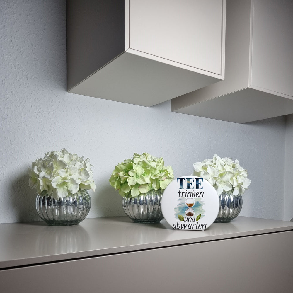 - Diese einzigartige Spardose im ovalen Design zeigt eine Sanduhr, die statt Sand mit duftenden Teeblättern gefüllt ist. Der obere Teil symbolisiert das Warten. Mit lebendigem Aquarell in Blau- und Grüntönen und zwei grünen Blättern verbreitet sie Ruhe. Der Spruch "Tee trinken und abwarten" steht prominent im Mittelpunkt.