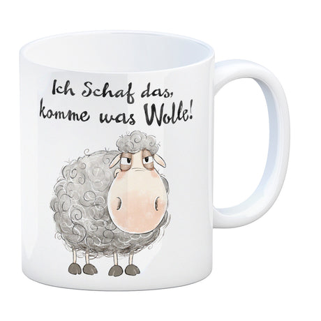 Schaf Kaffeebecher mit Spruch Ich Schaf das komme was Wolle