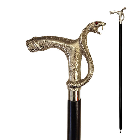 - Der Gehstock besteht aus edlem, schwarzem Holz und besticht durch einen abnehmbaren Knauf in Form eines Schlangenkopfes aus silbernem Metall. Die roten Augen der Schlange hypnotisieren förmlich, während der Gummipuffer am Ende sorgt dafür, dass Sie ohne Kratzer im Boden elegant dahinschlängeln.