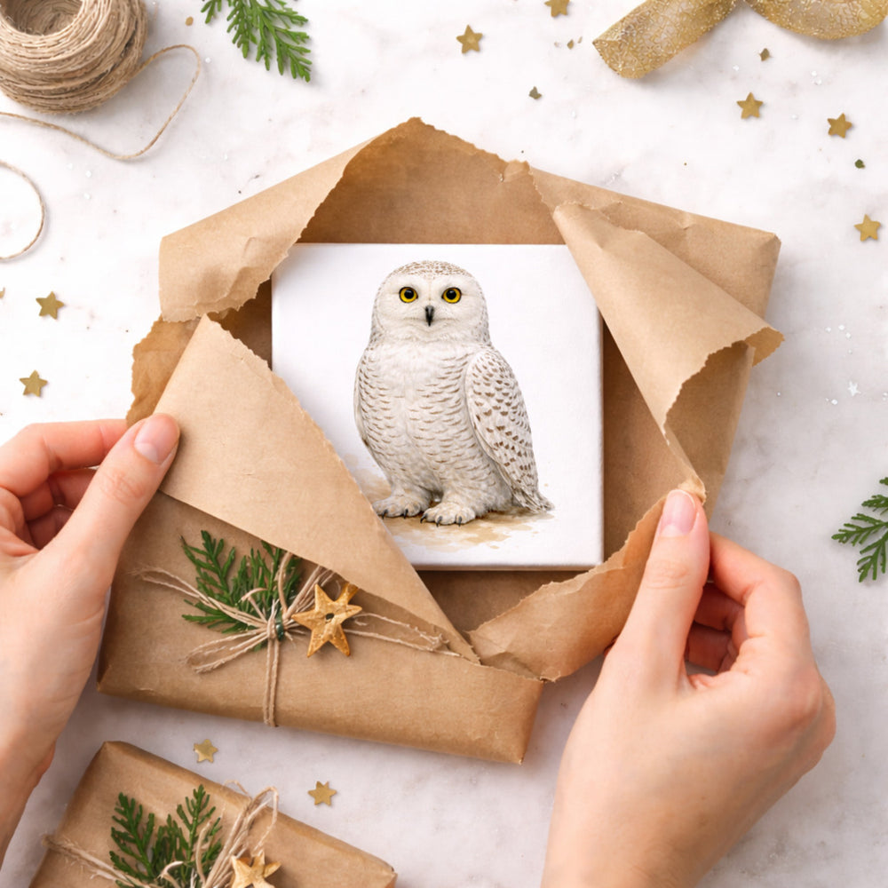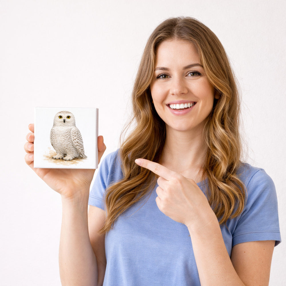 Schneeeulenzauber Schneeeulen Portrait Holzbild in 10x10 cm zum Stellen oder Aufhängen