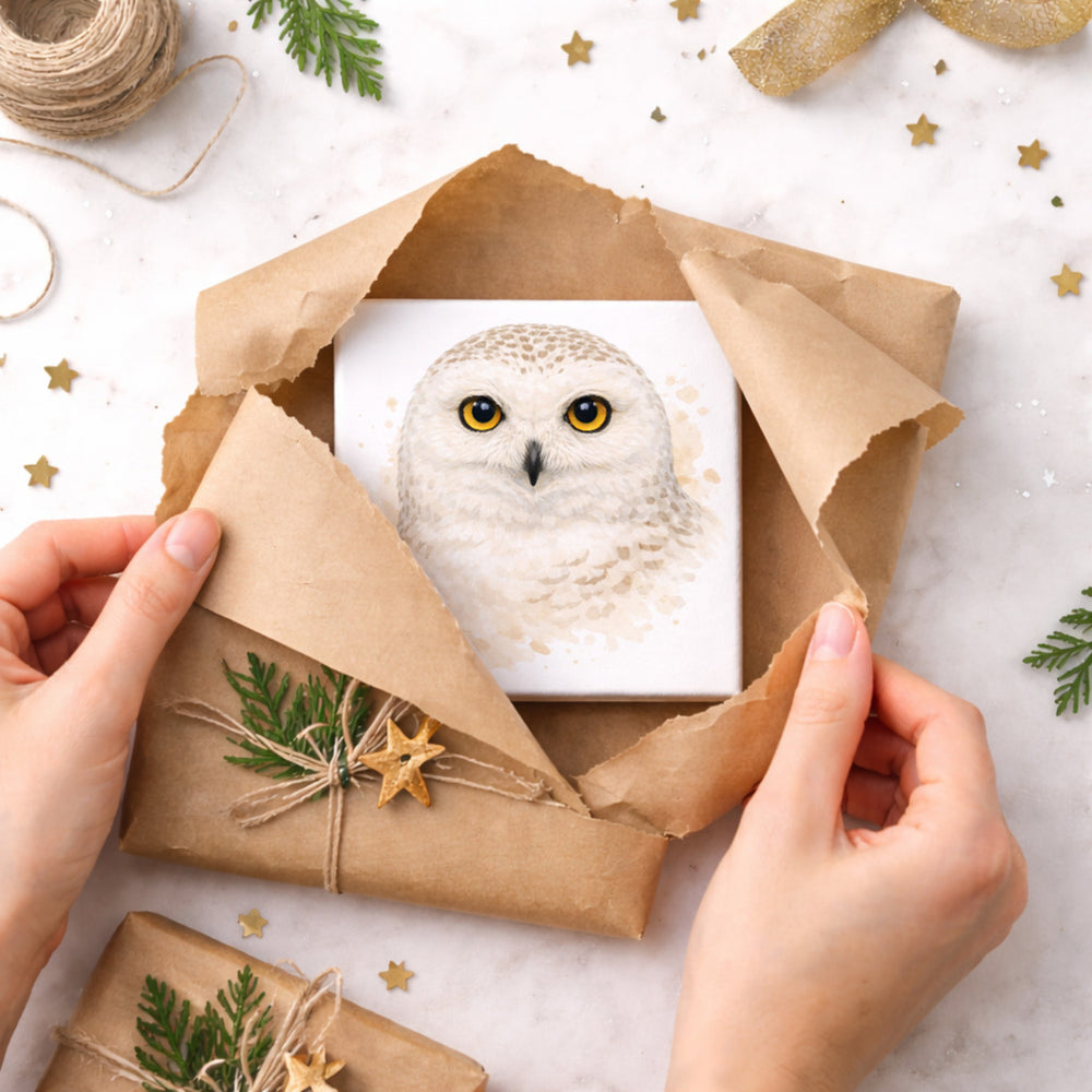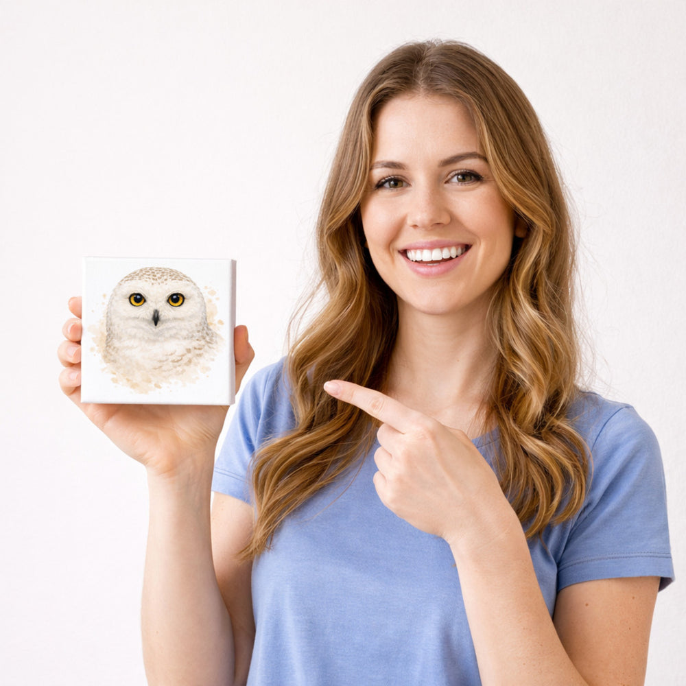 - 1x Schneeeulenzauber Schneeeulen Portrait Holzbild in 10x10 cm zum Stellen oder Aufhängen in der gewählten Größe