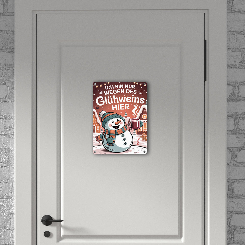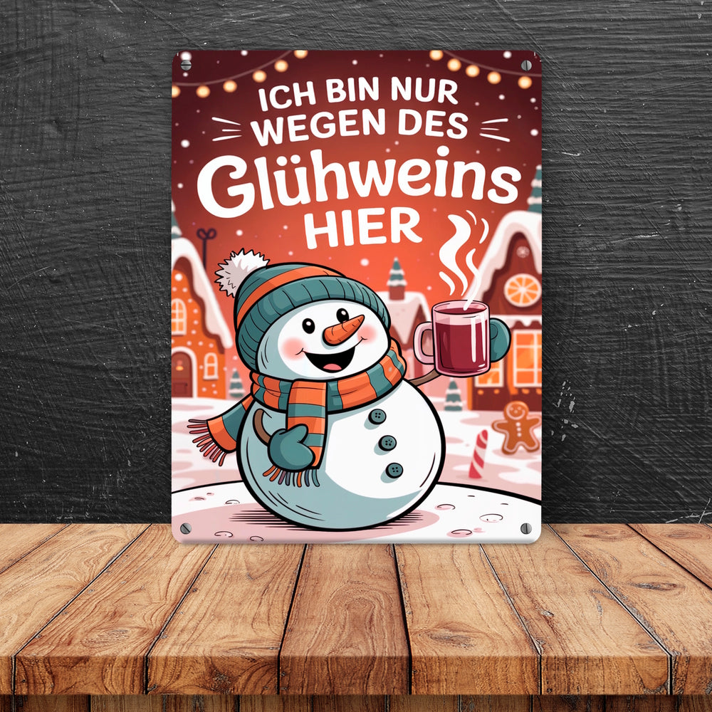 - Das Metallschild zeigt einen fröhlichen Schneemann in Mütze und Schal, der genüsslich eine Tasse Glühwein schwenkt. Drumherum funkeln Lichterketten, Lebkuchenhäuser strahlen Wärme aus und tanzender Schnee vollendet die winterliche Idylle. Der Spruch: "Ich bin nur wegen des Glühweins hier" lädt zum Schmunzeln ein.